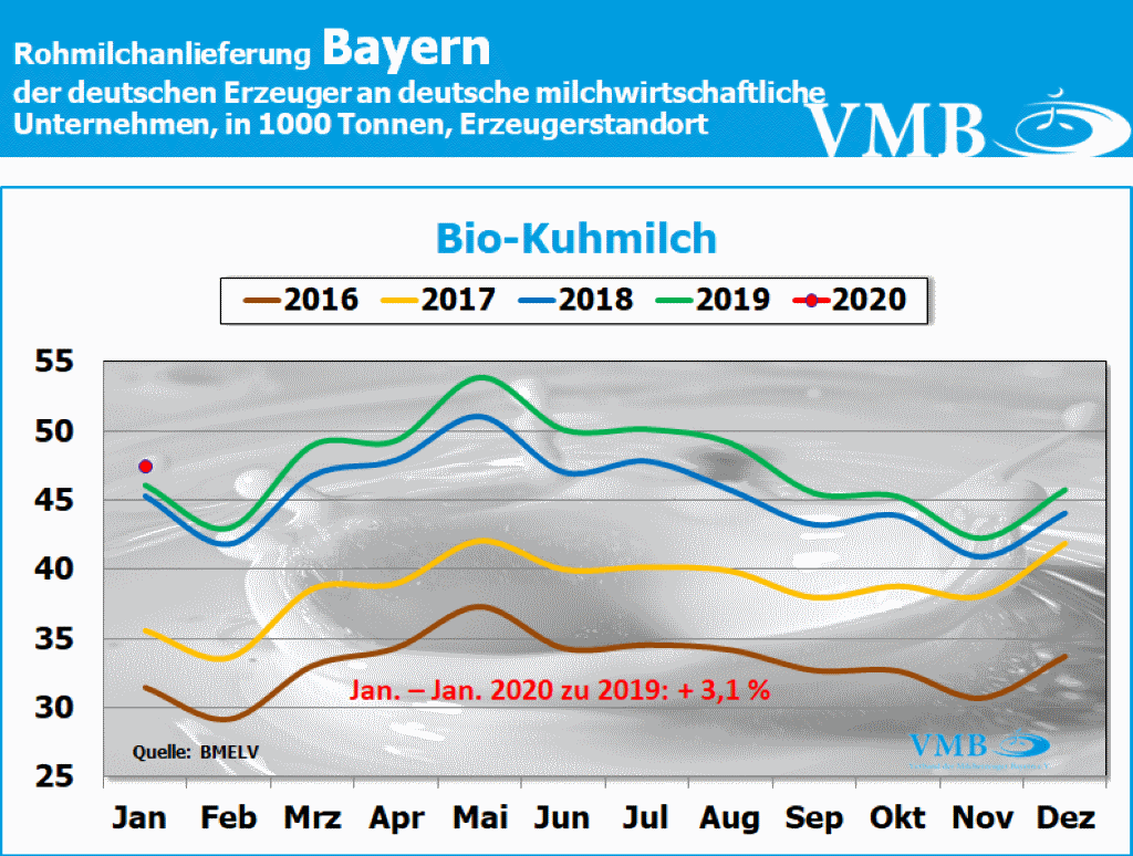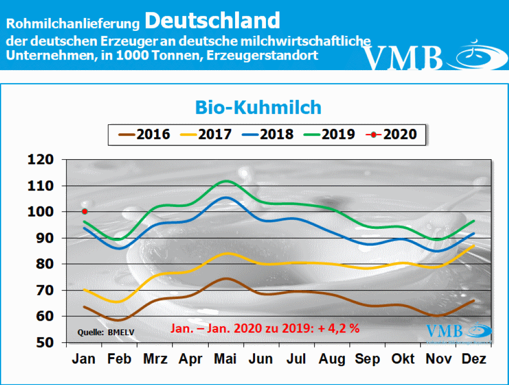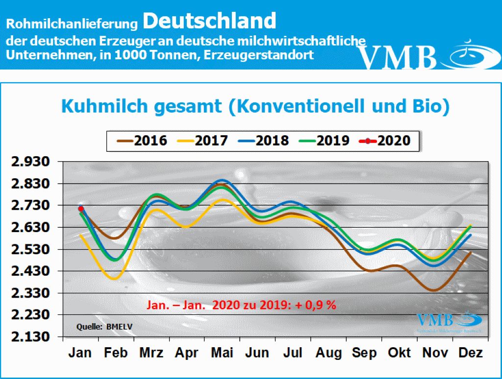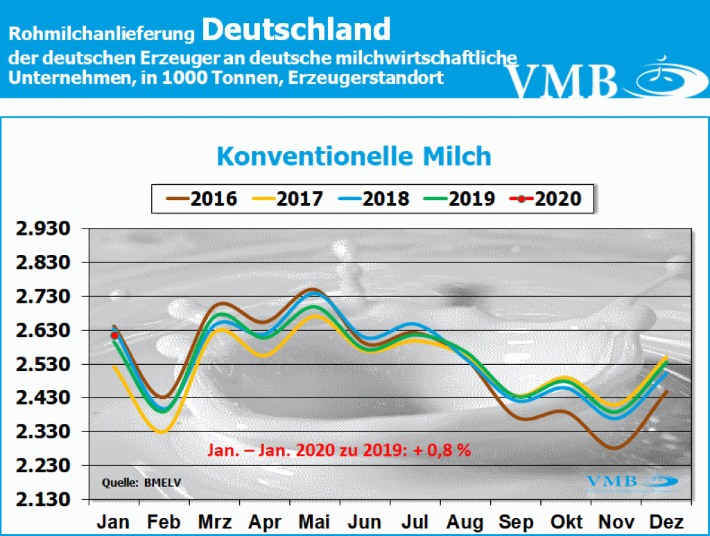 Bei der Veröffentlichung der deutschen Milchanlieferungen im Monat Januar 2020 hat die Bundesanstalt für Landwirtschaft und Ernährung (BLE) wieder einen Anstieg der Milcherzeugungsmengen gegenüber dem Vorjahresmonat gemeldet. Gegenüber dem vergleichbaren Vorjahresmonat wurden bei konventioneller Milch, wie auch bei der Bio-Milch, abermals deutliche Abstände festgestellt. Im konventionellen Bereich wurden von den deutschen Milcherzeugern 2,617 Milliarden Kilogramm Milch abgegeben. Damit errechnen sich über 20 Millionen Kilogramm bzw. 0,8 Prozent mehr Milch als im Jahr zuvor. Die Bio-Milcherzeugung ist, wie bereits in den vergangenen Jahren, wiederum um 4,2 Prozent angestiegen und hat somit erstmals die 100-Million-Kilogramm-Milchgrenze in einem Anlieferungsmonat überschritten. Mit einer Bio-Milchabgabe im Monat Januar 2020 von 100,386 Millionen Kilogramm, hat sich die Bio-Milchmenge um fast 4,1 Millionen Kilogramm Milch erhöht.