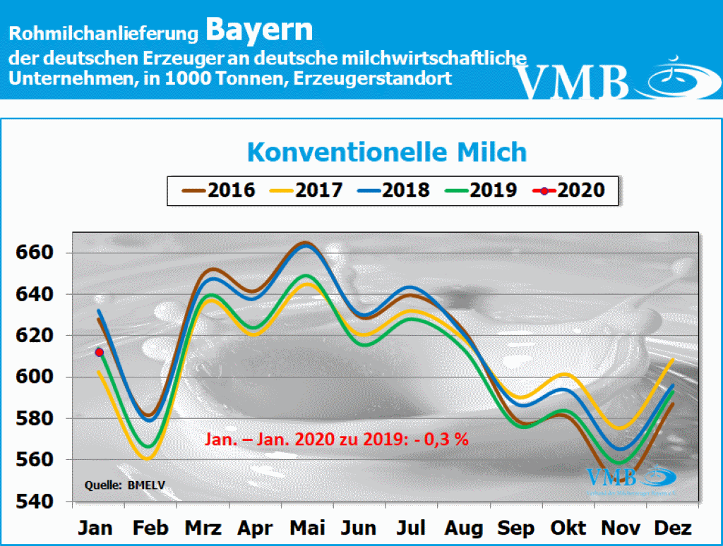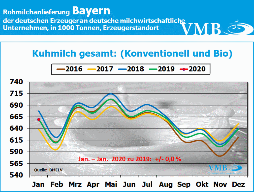 Bayern hat in der Gesamtmilcherzeugung im Januar 2020 das Vorjahresniveau beibehalten. Auch wenn die konventionelle Milcherzeugung ein Minus von 0,3 Prozent aufweist und die Erzeugungshöhe von Bio-Milch nochmals mit einem Plus 3,1 Prozent startete, befindet sich die Gesamtsumme der bayerischen Milcherzeugung fast punktgenau auf den Vorjahreswerten.