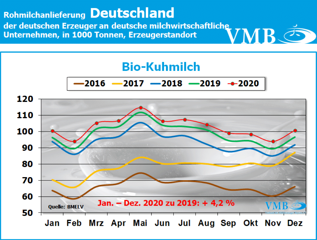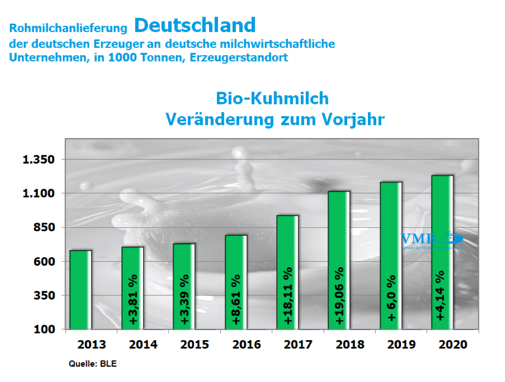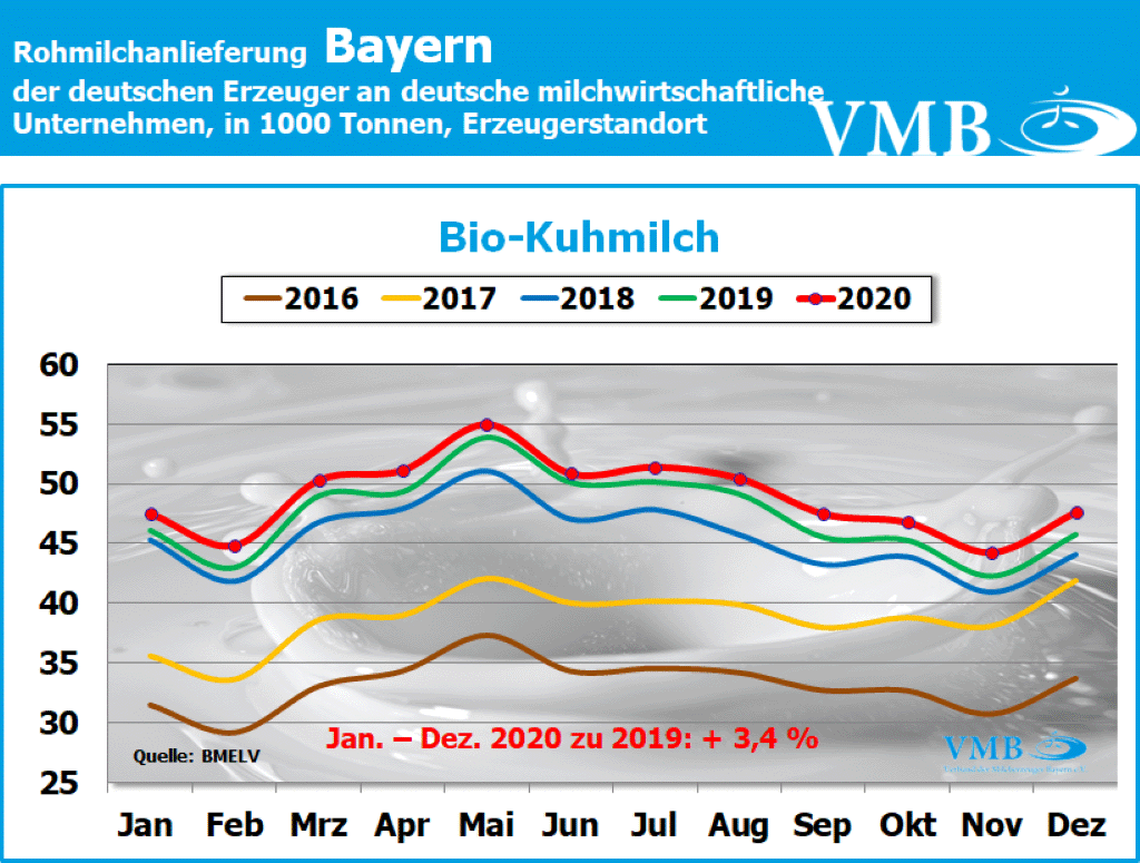 Der derzeitige deutsche Anlieferungstrend der Biomilch, welcher sich ohne starke Abweichungen das ganze Jahr über errechnen lässt, ist auch in ähnlicher Weise in fast allen Bundesländern aufgetreten. Auch in Bayern hat die ökologisch/biologischen Milcherzeugung durchschnittlich ein Plus von 3,4 Prozent erlangt. Folglich wurde eine Gesamtmenge von fast 589 Millionen Kilogramm Milch und damit 30 Millionen Kilogramm mehr als zum Vorjahr ermittelt. Somit liegt Gesamtsumme der bayerischen Bio-Milcherzeugung noch knapp unter der 600-Millionen-Kilogramm-Grenze. In Deutschland wurde erstmalig insgesamt über 1,234 Milliarden Kilogramm Bio-Milch erzeugt. Damit ist die Milchmenge um 50 Millionen Kilogramm höher als im Jahre 2019. Da gegenwärtig das Absatzpotenzial von Bio-Milchprodukten sich erhöht hat, bedingt auch durch die Corona-Pandemie und einer daraus folgenden stärkeren Nachfrage nach regionalen und ökologisch/biologischen Milchprodukten, nimmt der Markt, bei steigenden Preisen, Bio-Milch freundlich auf. Diese Marktkonstellation bewirkt, dass Bio-Milch verarbeitende Unternehmen auch wieder verstärkt Umsteller-Betriebe (von konventionell zu biologischer Milchproduktion) aufnehmen. Infolgedessen wird vermutlich das Erzeugungspotenzial in ähnlicher prozentualer Ausrichtung wie in den vergangenen Jahren erfolgen. Dies hat zur Folge, dass unter Umständen in Bayern im Jahr 2021 die 600-Millionen-Kilogramm-Milchgrenze bzw. in Deutschland eventuell die 1,3-Milliarden-Kilogramm-Grenze überschritten wird.