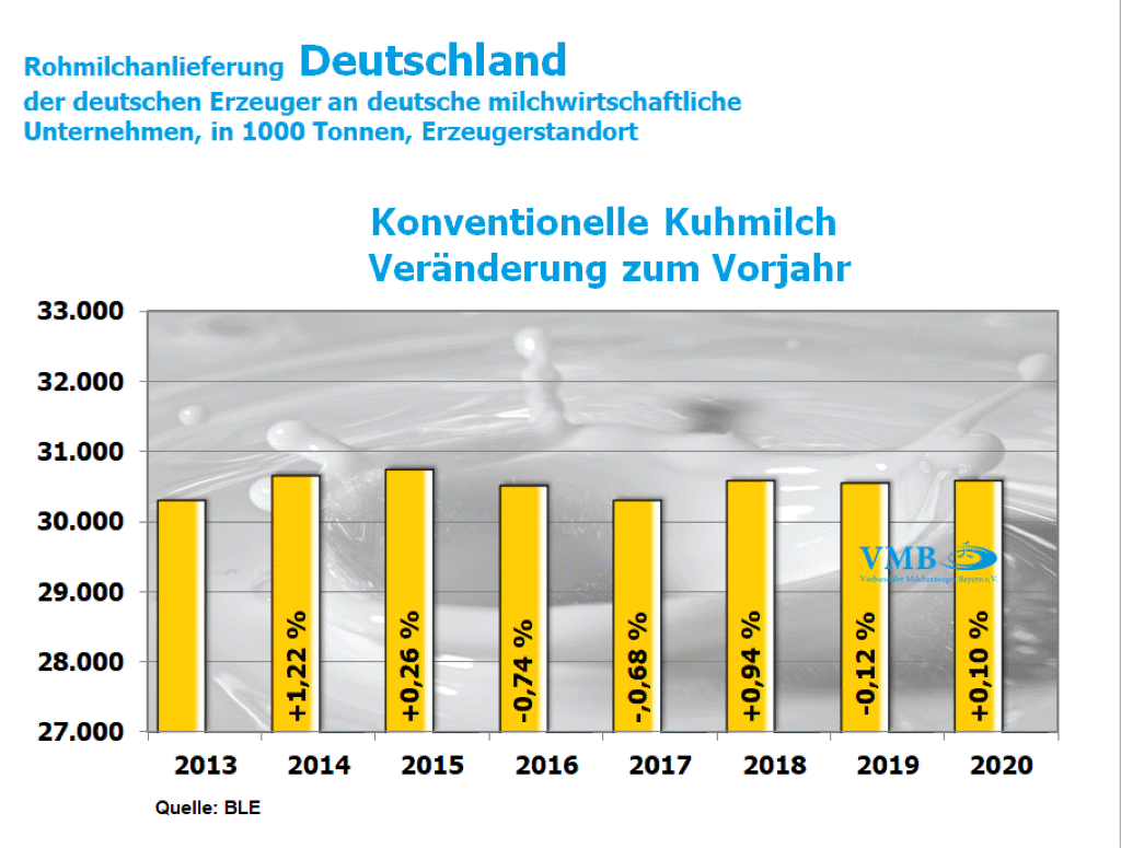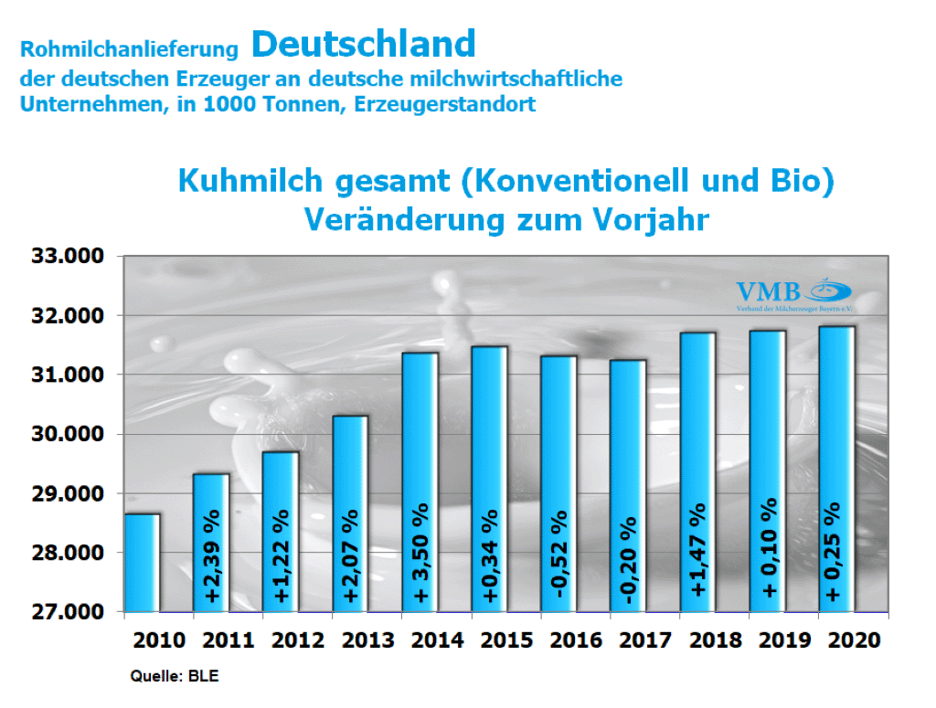 In ihrer aktuellen Berechnung meldet die Bundesanstalt für Landwirtschaft und Ernährung (BLE) im Jahr 2020 bei der konventionellen Milch eine Erfassungshöhe von 2,502 Milliarden Kilogramm und somit einen Rückgang von Minus 1,3 Prozent. Dies entspricht einer Reduzierung von knapp 34 Millionen Kilogramm Milch. Dagegen weist die Erzeugungsmenge der ökologisch/biologischer Milcherfassung einen weiterhin ansteigenden Trend auf. Die Bio-Milchproduktion liegt somit im Monat Dezember 2020 bei 100,7 Millionen Kilogramm und zeigt damit eine Überschreitung der Vorjahresmenge in Höhe von 4,2 Prozent an.