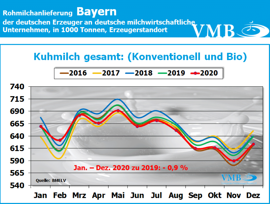 Die Bekanntmachung der Bundesanstalt für Landwirtschaft und Ernährung (BLE) über die deutschen Milchanlieferungszahlen für den Monat Dezember 2020 zeigt, dass wiederum ein Rückgang gegenüber dem Vorjahresmonat ermittelt worden ist. Die Gesamtmilcherzeugung (konventionelle und ökologisch/biologische Milch) liegt nun auf einer Höhe von 2,603 Milliarden Kilogramm Milch. Somit wurden gegenüber dem Dezember 2019 knapp 30 Millionen Kilogramm Milch weniger angeliefert. Dies bedeutet ein Minus von 1,1 Prozent.