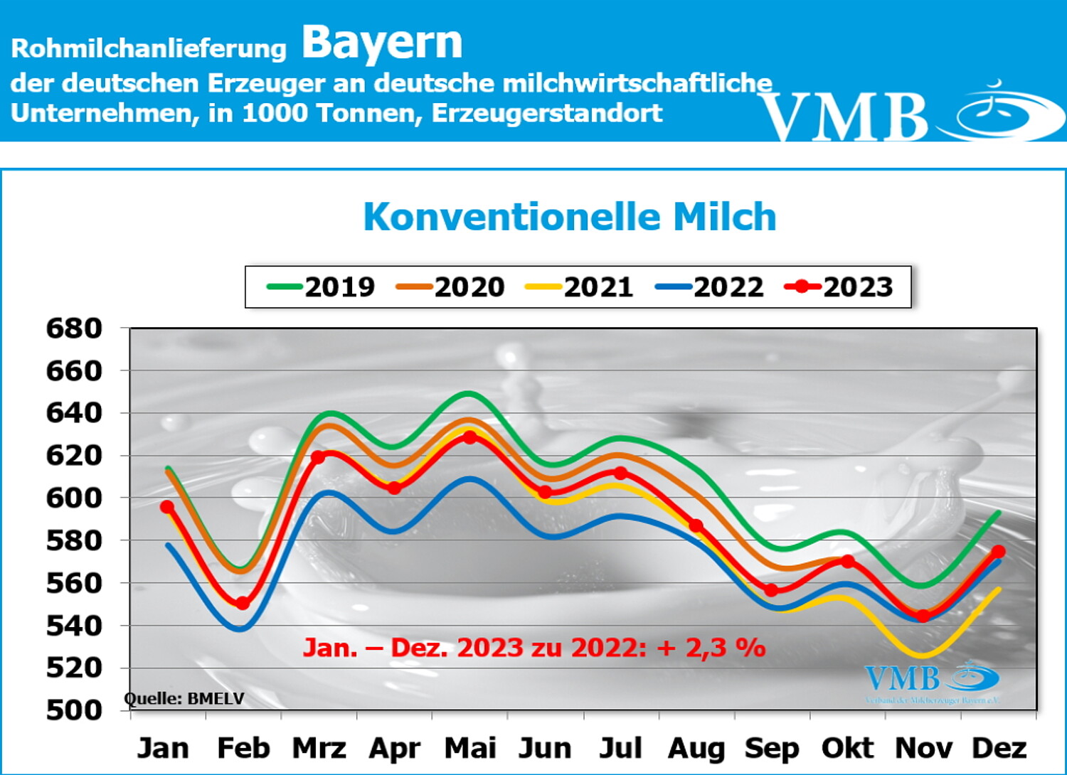 Mit der Veröffentlichung der Milchanlieferungsmenge für den Dezember, durch die Bundesanstalt für Landwirtschaft und Ernährung (BLE), ist nun auch die Statistik für das Jahresmilchaufkommen 2023 komplett. Entgegen dem Vorjahr hat die Gesamtmilchmenge (aus konventioneller und bio-/ökologischer Milch) in Deutschland im Jahr 2023 um 1,4 Prozent bzw. 429 Millionen Kilogramm auf 31,45 Milliarden Kilogramm Milch zugenommen. Die Milchanlieferungen an die deutschen Molkereien erholten sich saisontypisch im Dezember und bewegten sich mit 2,570 Milliarden Kilogramm Milch gut 5,5 % über dem Niveau des Novembers. Das Milcherzeugungsniveau aus dem Dezember 2022 wurde moderat um 0,3 Prozent unterschritten. Zum Jahresbeginn 2024 zeigt sich die Milchanlieferung in Deutschland saisonal zunehmend, liegt aber hinter dem Vorjahresniveau zurück.