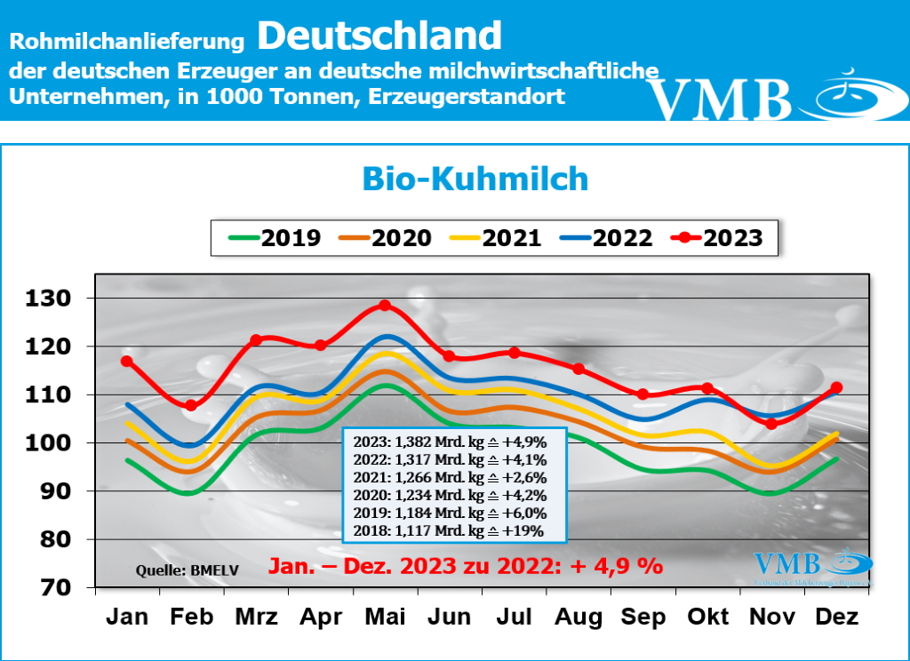 Nachdem die ökologische/biologische Milcherzeugung im November erstmals seit Erhebung der Biomilchmenge einen Rückgang verzeichnete, stabilisierte sich die erfasste Milchmenge im Dezember und bewegte sich nur leicht über der gemeldeten Menge des Vorjahresmonats (+0,8 %). Auf Jahressicht entwickelte sich das Milcherzeugungsniveau in Deutschland in diesem Sektor weiter nach oben und erhöhte sich um fast 5 Prozent auf 1,382 Milliarden Kilogramm Milch. Das entspricht einen Anteil von 4,4 Prozent der in Deutschland angelieferten Kuhmilch. Bayerische Biomilcherzeuger lieferten in Jahressumme 678,002 Millionen Kilogramm und damit gut 28 Millionen Kilogramm oder 4,4 Prozent mehr Milch ab. Bayern bleibt somit das dominierenden Milcherzeugerland der Biomilchproduktion im Bundesgebiet mit einem Anteil von 49,1 Prozent.