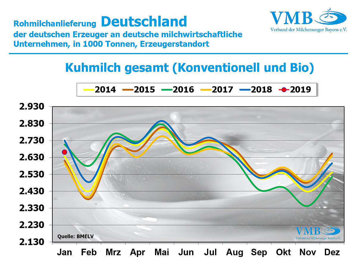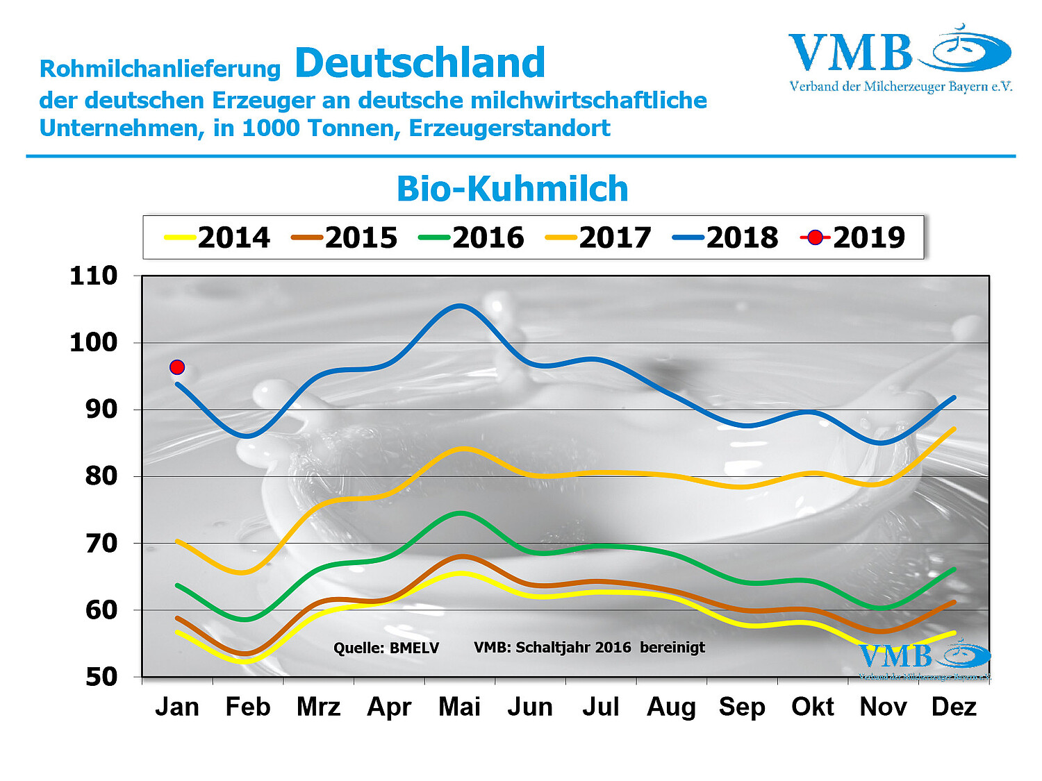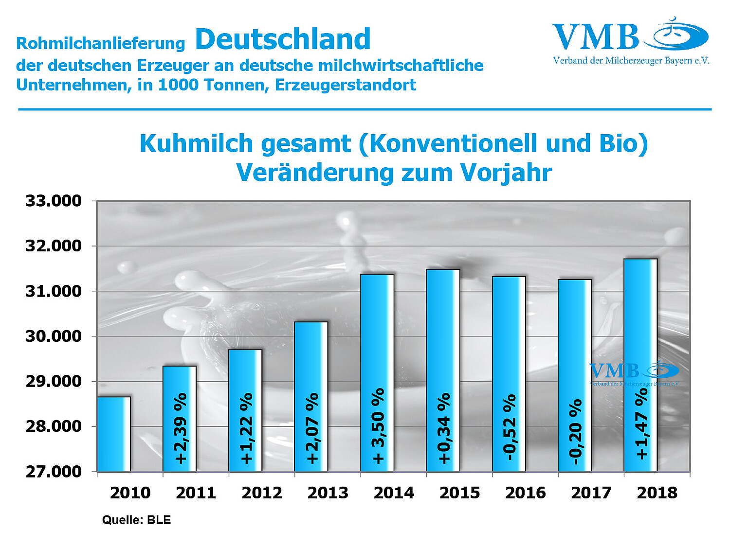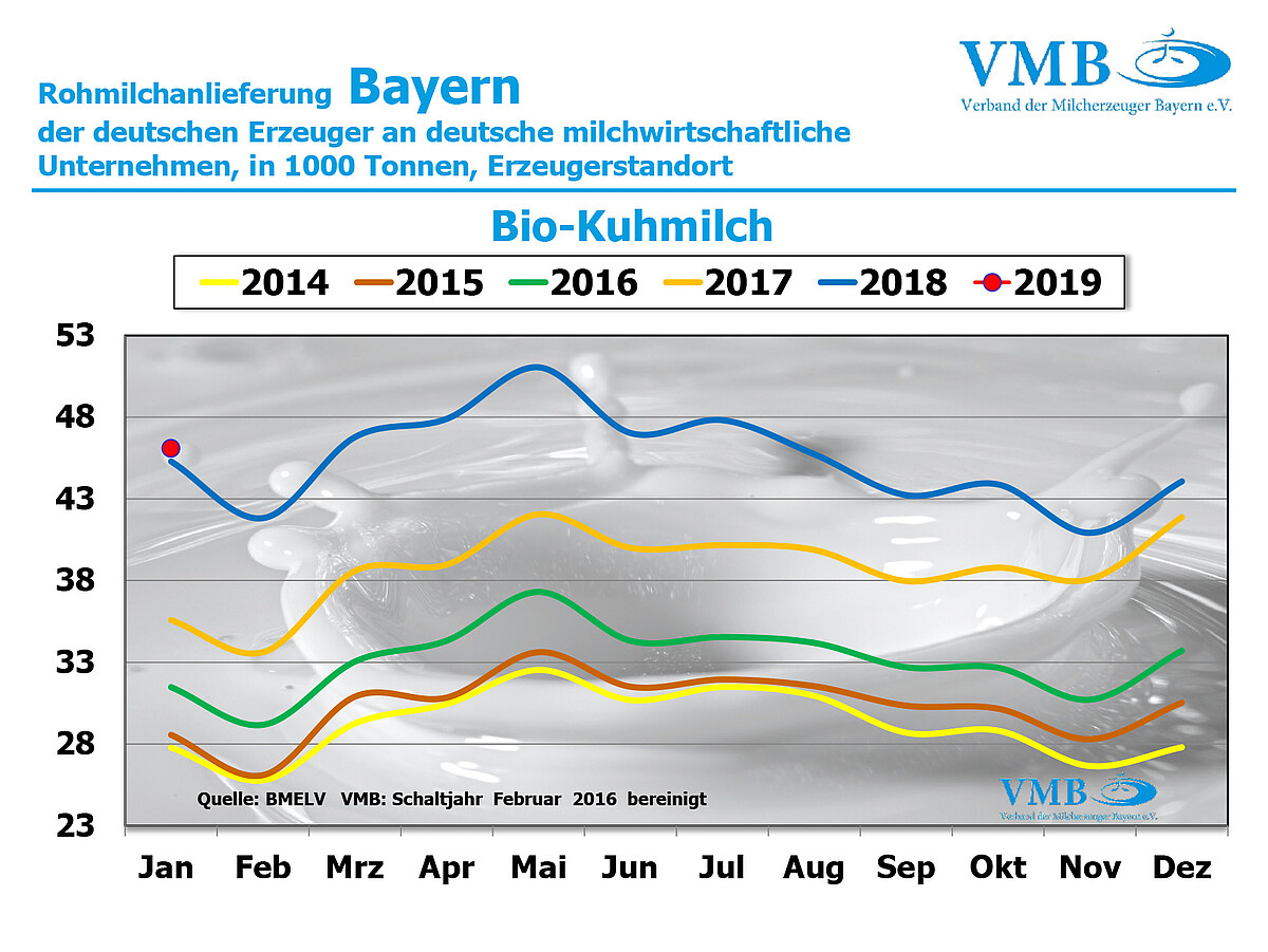 In der differenzierten Betrachtung der Anlieferungswerte nach den verschiedenen Milchsorten wird allerdings offensichtlich, dass der negative Trend nicht bei jeder Milchart eingeschlagen wurde. Während die konventionelle Milch in der Anlieferung in Deutschland um gut 70 Millionen Kilogramm zurückgegangen ist und ein Minus von 2,7 Prozent aufweist, verfügt die ökologische Milcherzeugung weiterhin über einen ansteigenden Erzeugungstrend. Mit 2,5 Millionen Kilogramm mehr Milchmenge im Januar 2019, erzielt die Bio-Milch ein Plus von 2,6 Prozent mit einer Erzeugungsgroße von 96,3 Millionen Kilogramm. Ebenfalls im ähnlichen Umfang bestätigen die bayerischen Milcherzeuger in den letzten Monaten diesen in Deutschland eingeschlagenen Trend.