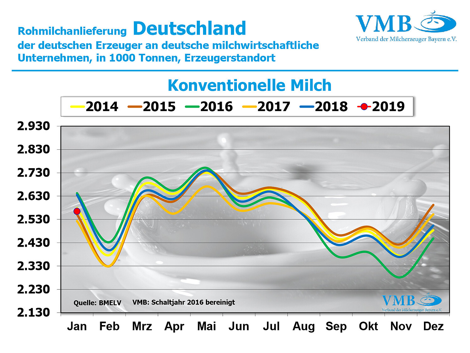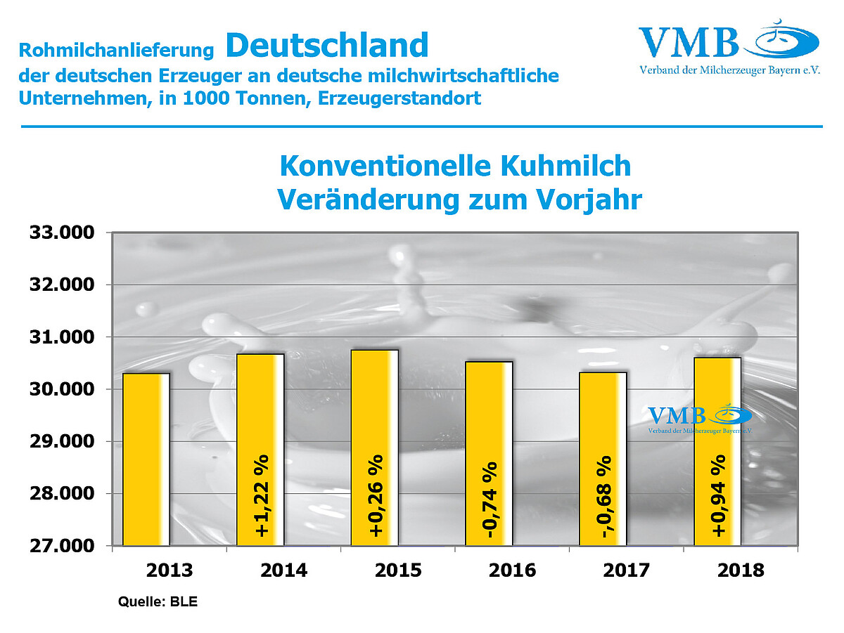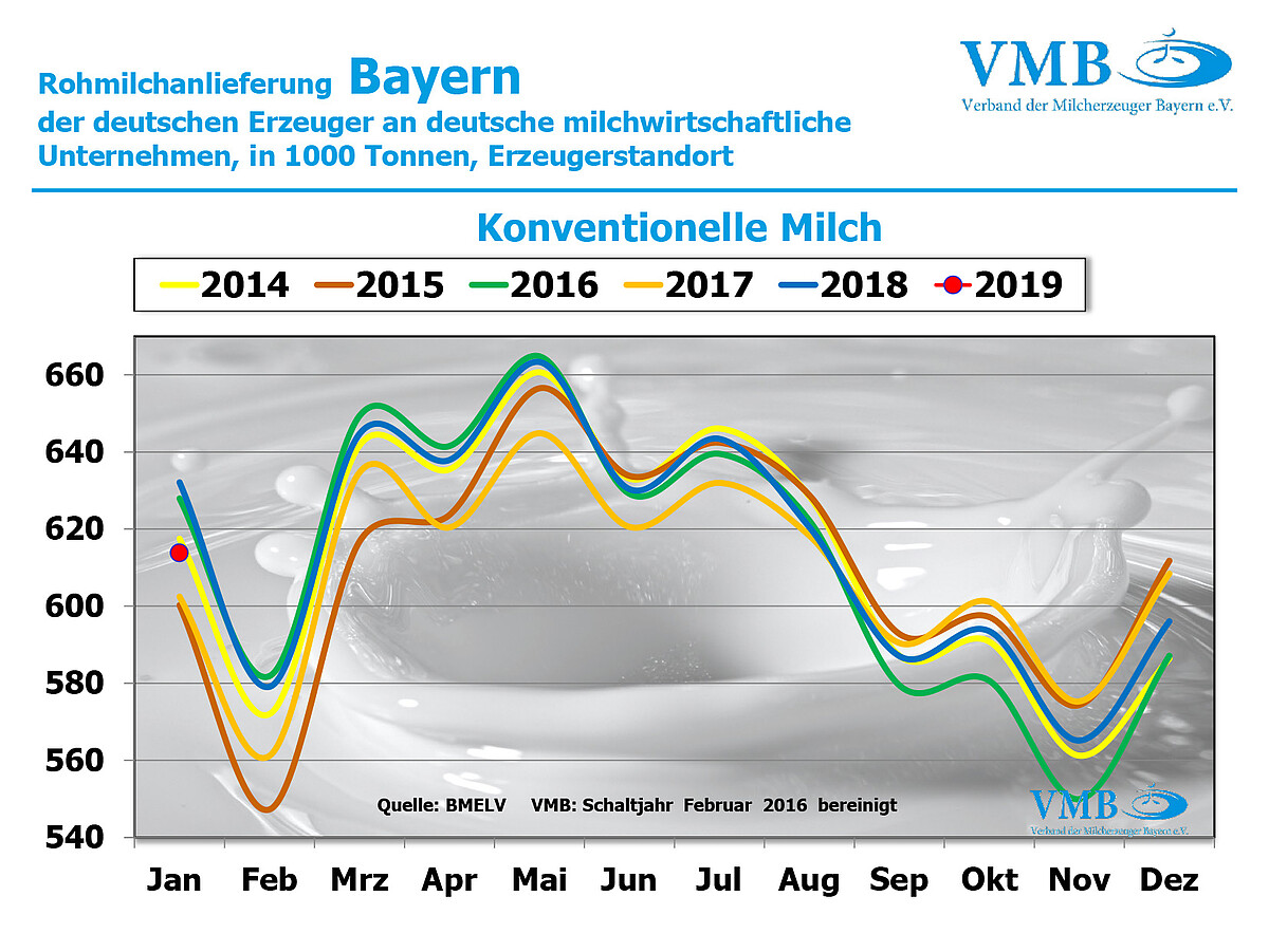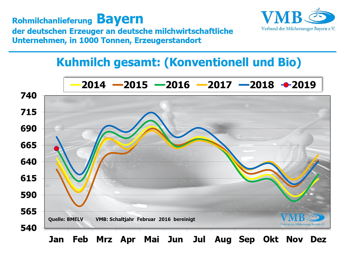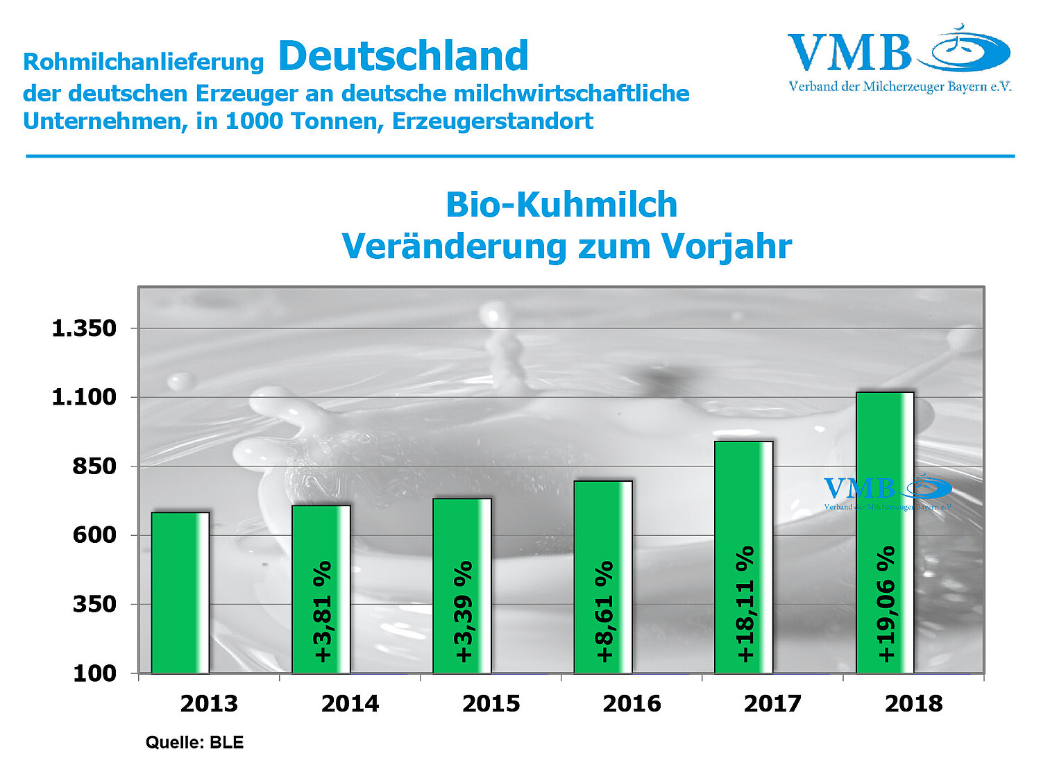 In der differenzierten Betrachtung der Anlieferungswerte nach den verschiedenen Milchsorten wird allerdings offensichtlich, dass der negative Trend nicht bei jeder Milchart eingeschlagen wurde. Während die konventionelle Milch in der Anlieferung in Deutschland um gut 70 Millionen Kilogramm zurückgegangen ist und ein Minus von 2,7 Prozent aufweist, verfügt die ökologische Milcherzeugung weiterhin über einen ansteigenden Erzeugungstrend. Mit 2,5 Millionen Kilogramm mehr Milchmenge im Januar 2019, erzielt die Bio-Milch ein Plus von 2,6 Prozent mit einer Erzeugungsgroße von 96,3 Millionen Kilogramm. Ebenfalls im ähnlichen Umfang bestätigen die bayerischen Milcherzeuger in den letzten Monaten diesen in Deutschland eingeschlagenen Trend.