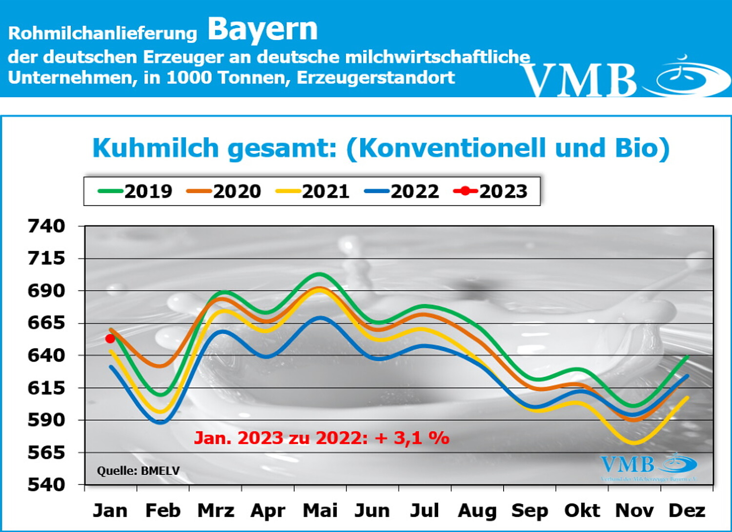 Die Statistik der deutschen Milchanlieferungsmenge, bekanntgegeben von der Bundesanstalt für Landwirtschaft und Ernährung (BLE), verzeichnet zum fünften Mal in Folge auch im neuen Jahr erneut eine Erhöhung in der Gesamtmilcherzeugung. Das in den letzten Monaten gedämpfte Anlieferungsverhalten in Ostdeutschland hat sich gelegt. Auch hier sind in allen ostdeutschen Bundesländern Ausdehnungen zu verzeichnen. Die Biomilchabgabe verharrt für den Januar 2023 weiterhin auf einem hohen Niveau. Das veröffentlichte Milchaufkommen für die Gesamtmilchmenge (aus konventioneller und bio-/ökologischer Milch) für den Januar 2023 beträgt 2,685 Milliarden Kilogramm. Der Anstieg zum Vorjahresmonat liegt nun etwas „imposanter“ bei 3,1 Prozent, sodass in Summe 80 Millionen Kilogramm Milch mehr angeliefert wurde.