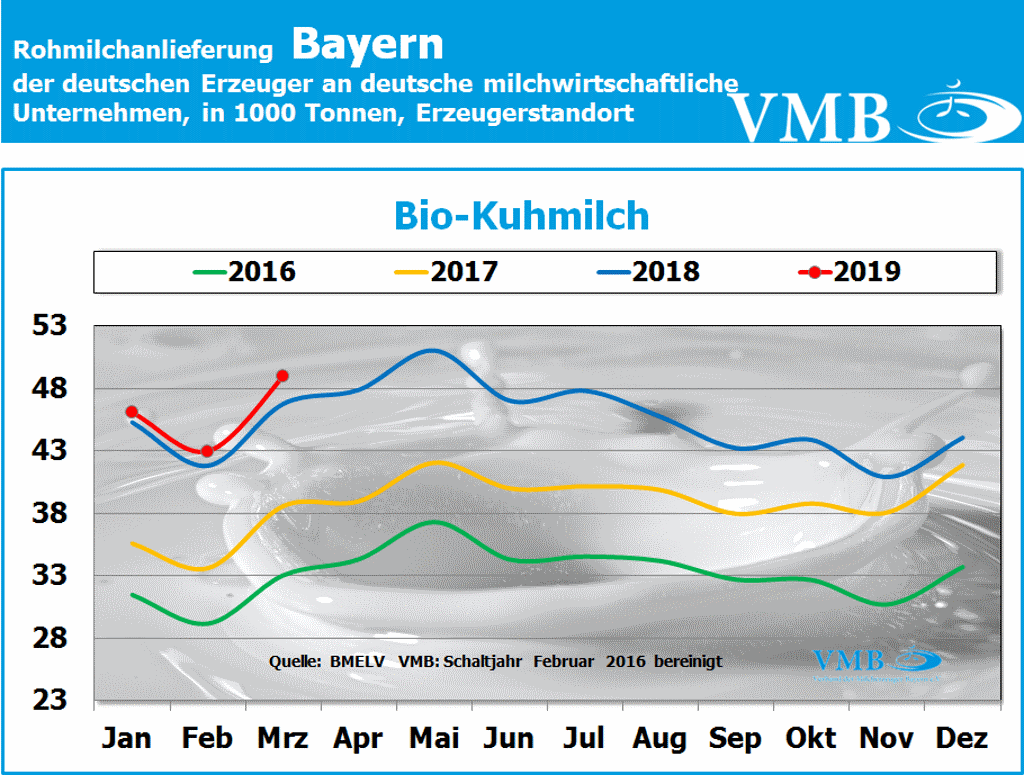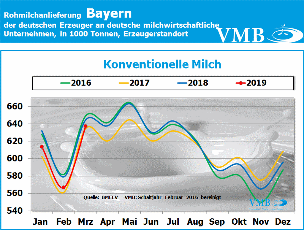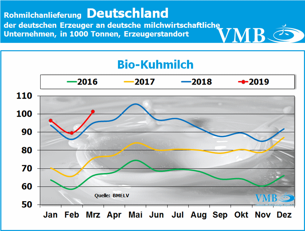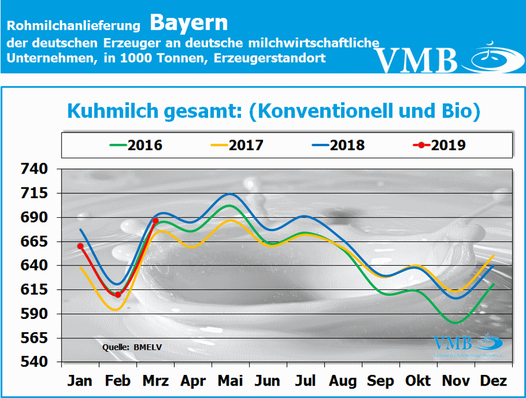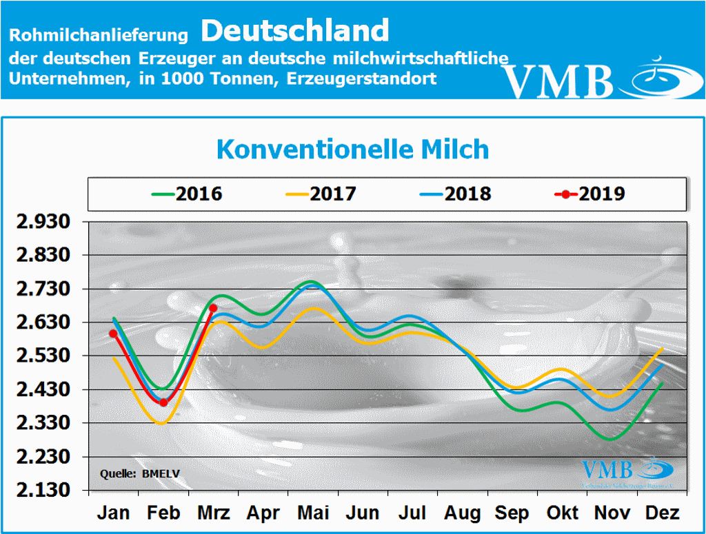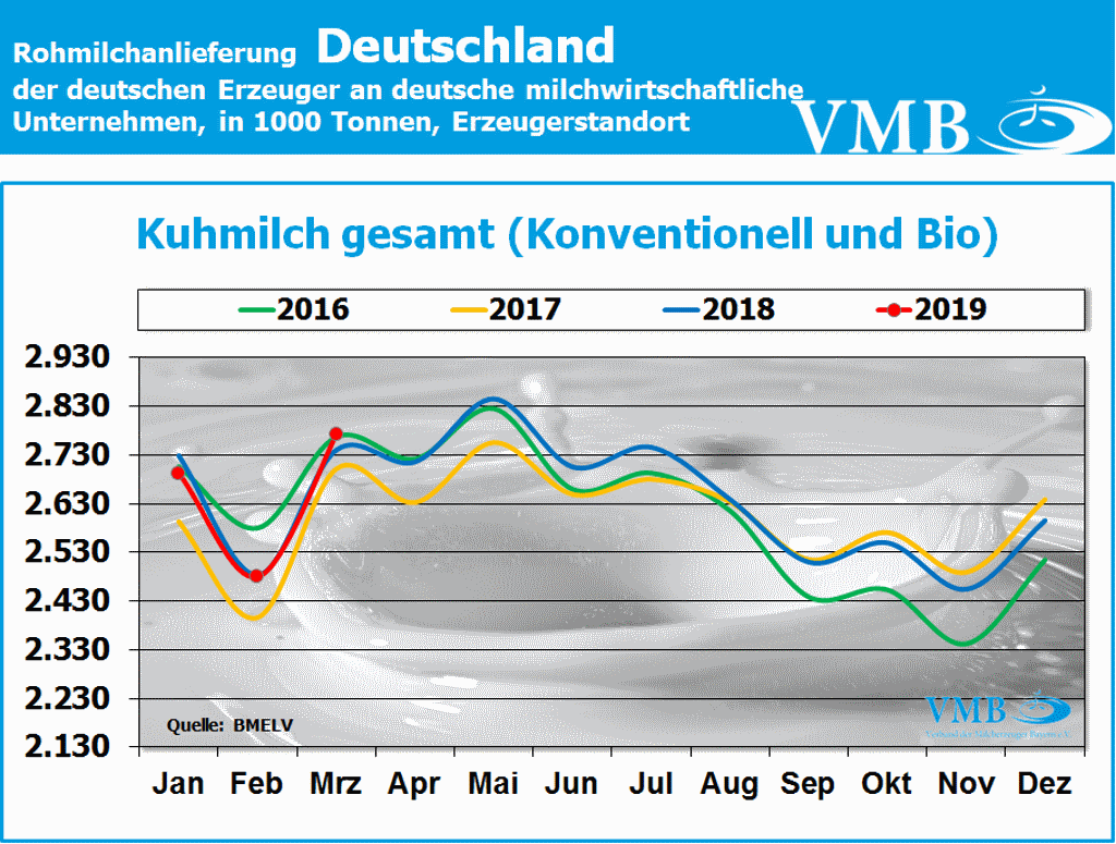 Die Auswertungen der Gesamtmilcherzeugungen in Deutschland für den Monat März 2019 zeigen, dass die Milchproduktion teils deutlich wieder Anschluss an das Vorjahresniveau gefunden hat. Die Erzeugung der verschiedenen Kuhmilchsorten in Deutschland ergab eine aufsummierte Menge in Höhe von 7,944 Milliarden Kilogramm Milch. Diese Höhe deutet, mit einem Minus von 0,1 Prozent, fast auf das Vorjahresniveau hin. Obwohl die Gesamtmenge noch ein Minus aufweist, zeigen die aktuellen März-Auswertungen, dass teilweise im konventionellen wie auch im ökologisch/biologischen Bereich in Deutschland die Vorjahreshöhe übersprungen worden ist. Einige Bundesländer haben inzwischen, trotz den negativen Aussagen über den verminderten Futterbestand aufgrund der letztjährigen Trockenheit, wiederum kräftiger produziert und somit Werte des Vorjahresmonats überholt.