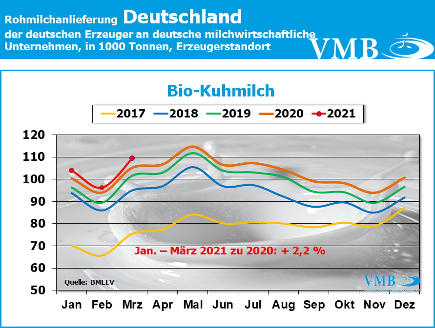 Die derzeit guten Absatzmöglichkeiten der ökologisch/biologischen Milchprodukte sowie auch der sonstigen landwirtschaftlichen Erzeugnisse, bescheren der Bio-Milchproduktion eine verstärkte Vermarktung. Dementsprechend nehmen die bayerischen wie auch die deutschen Molkereien weiterhin Bio-Milch erzeugende Betriebe in ihre Erfassung auf. Es ist daher nicht verwunderlich, dassdeshalb in der Statistik auch im Monat März 2021 das Erzeugungspotenzial angestiegen ist. In Bayern wie auch in Deutschland liegt die Steigerung zum Vorjahr bei über 4 Prozent. Infolgedessen wurden insgesamt in Deutschland fast 110 Millionen Kilogramm Bio-Milch erzeugt, was ein Plus von 4,1 Prozent darstellt. In Bayern erhöhte sich das Bio-Milch Erzeugungspotenzial um gut 2,5 Millionen Kilogramm und liegt im Berechnungszeitraum bei 52,7 Millionen Kilogramm, also errechnet sich ein Plus von 4,9 Prozent.