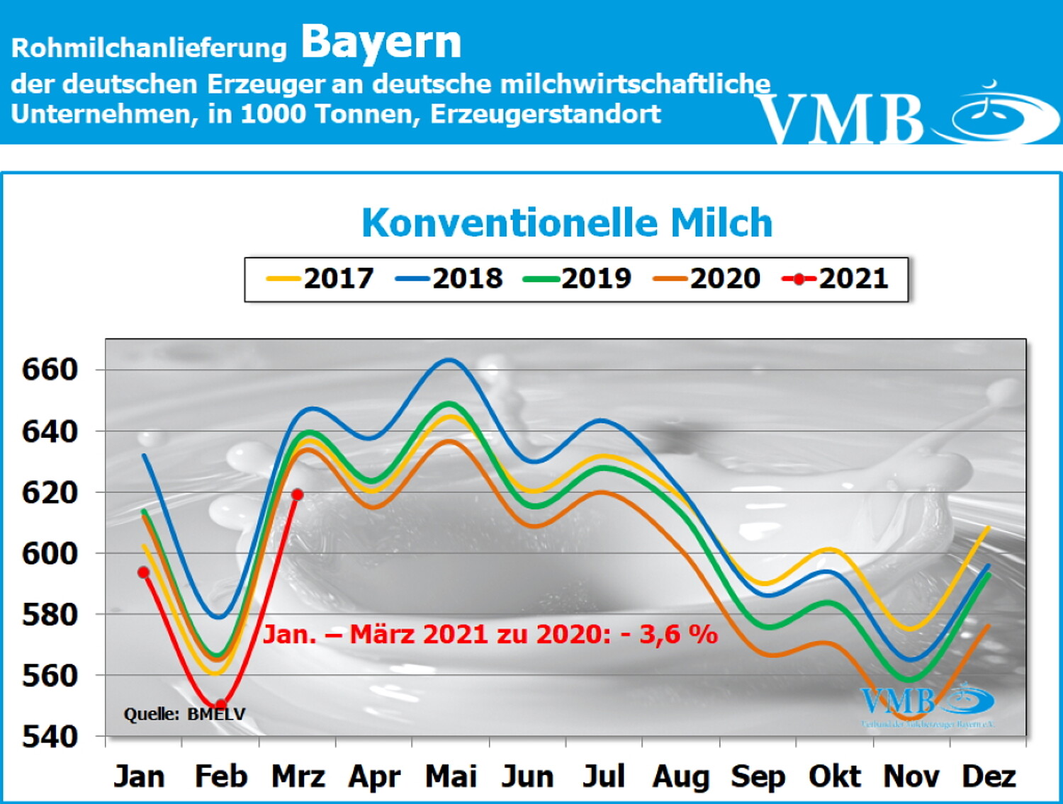 Die Bundesanstalt für Landwirtschaft und Ernährung (BLE) ermittelt für den Monat März 2021 bei der konventionellen Milch eine Anlieferungshöhe von 2,643 Milliarden Kilogramm Milch. Rechnerisch verringert sich folglich die Erzeugungsmenge um 40,5 Millionen Kilogramm Milch. Dies entspricht einem Prozentsatz von Minus 1,5 gegenüber dem Vorjahr.
