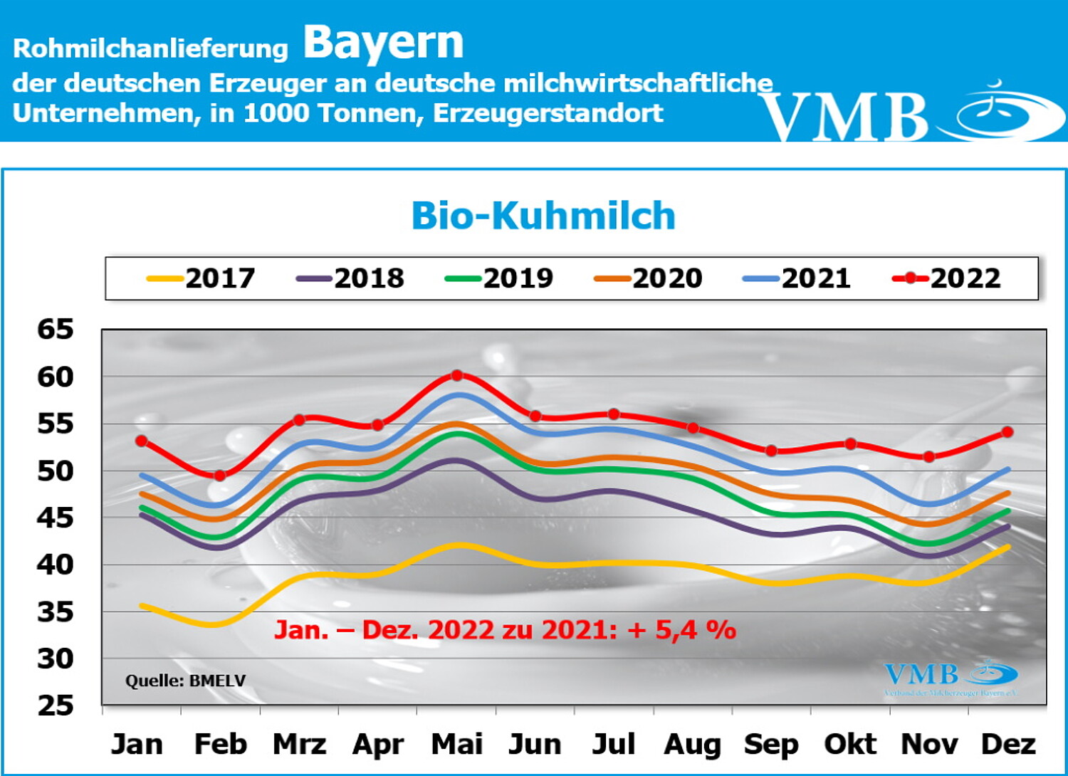 Seit der differenzierten Erhebung der Milchproduktion 2012 in zwei Sorten, hat die Biomilchproduktion kontinuierlich von Jahr zu Jahr zulegen können. Offiziell startet die amtlich erhobene Biojahresmilchmenge mit etwas mehr als 500 Millionen Kilogramm Milch in Deutschland. In den Folgejahren waren mitunter prozentual sogar zweistellige Zuwachsraten zu verzeichnen. Für das Kalenderjahr liegt die Jahresbilanzierung bei einer Höhe von 1,317 Milliarden Kilogramm Milch bzw. bei einem Plus von 4,1 Prozent oder eine mehr zu vermarktende Milchmenge von etwas mehr als 50 Millionen Kilogramm Milch. Für den aktuellen Monat Dezember ergab die Auswertung ein Plus von 8,4 Prozent. In Bayern verläuft die Jahresabrechnung in ähnlicher Weise. Bayern erreichte eine Verbesserung von mehr als fünf Prozent. Es wurden fast 650 Millionen Kilogramm Milch abgegeben. Mit dieser Höhe erreichen die bayerischen Biomilcherzeuger wieder den Löwenanteil – also die Hälfte – der Biomilchproduktion hierzulande.