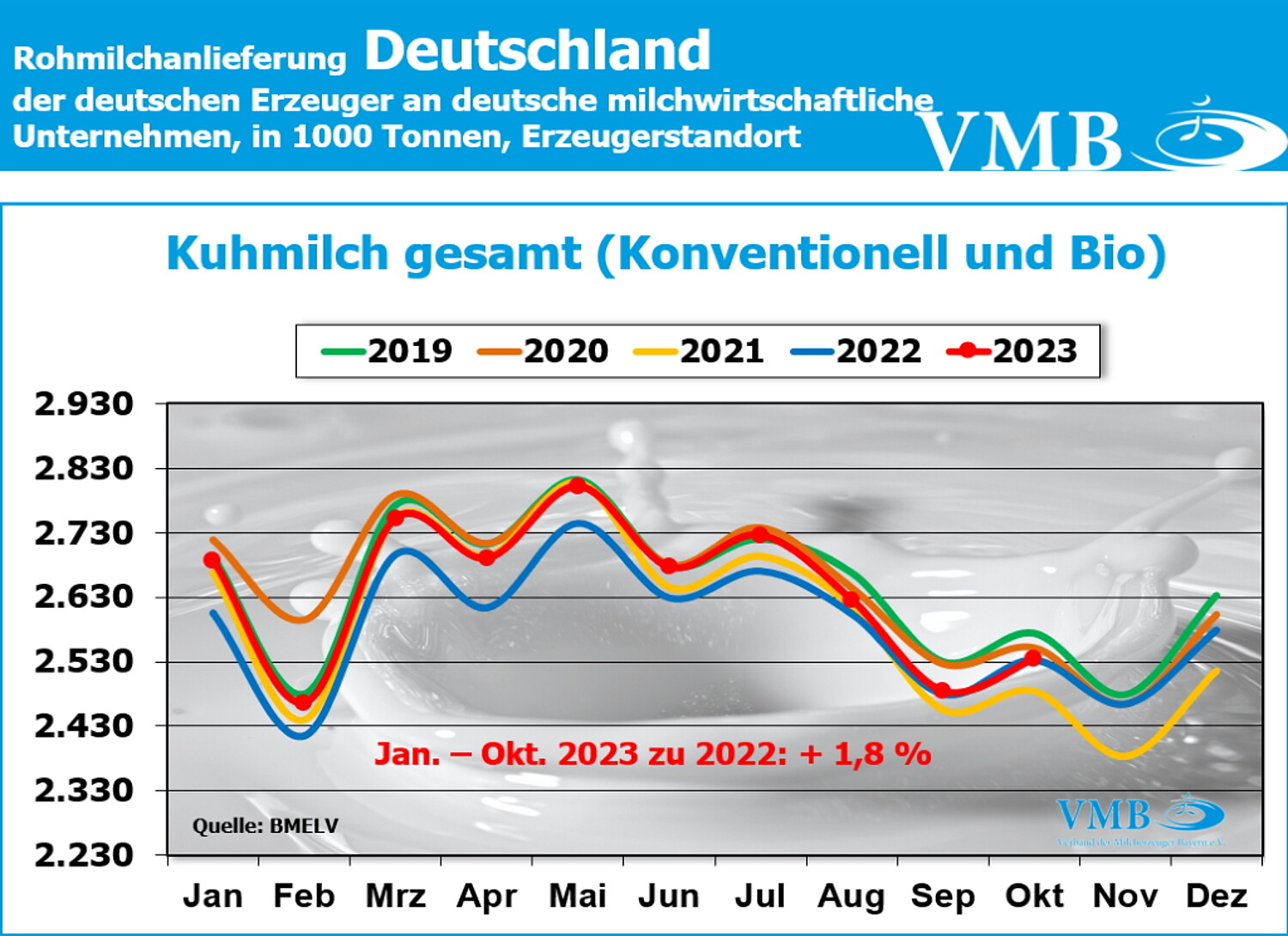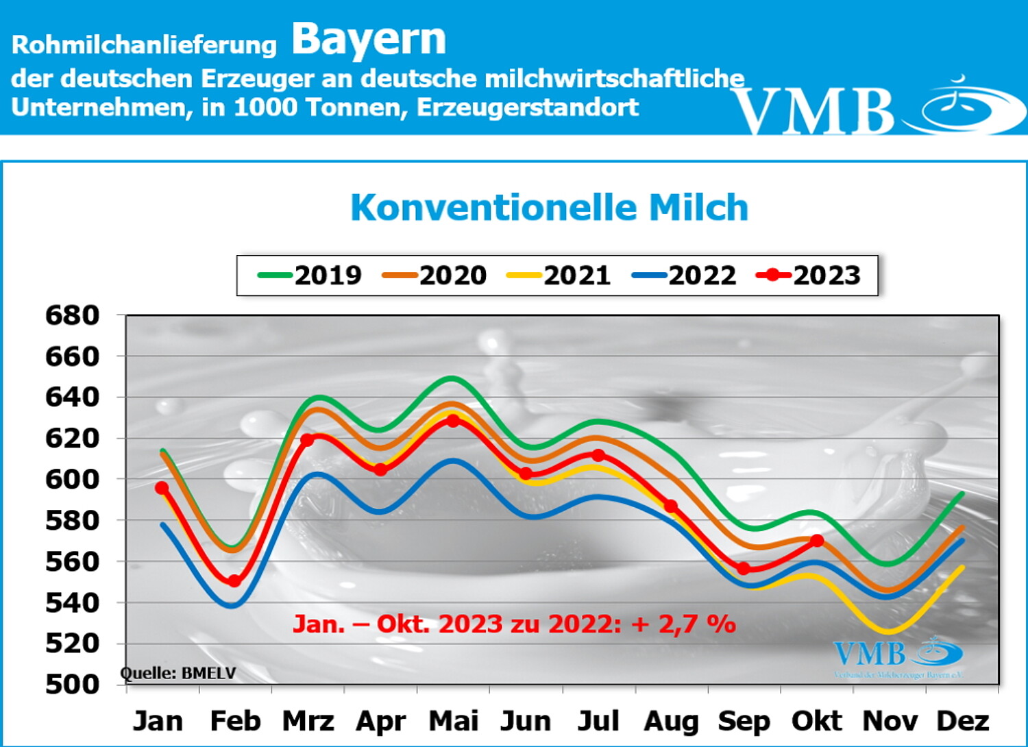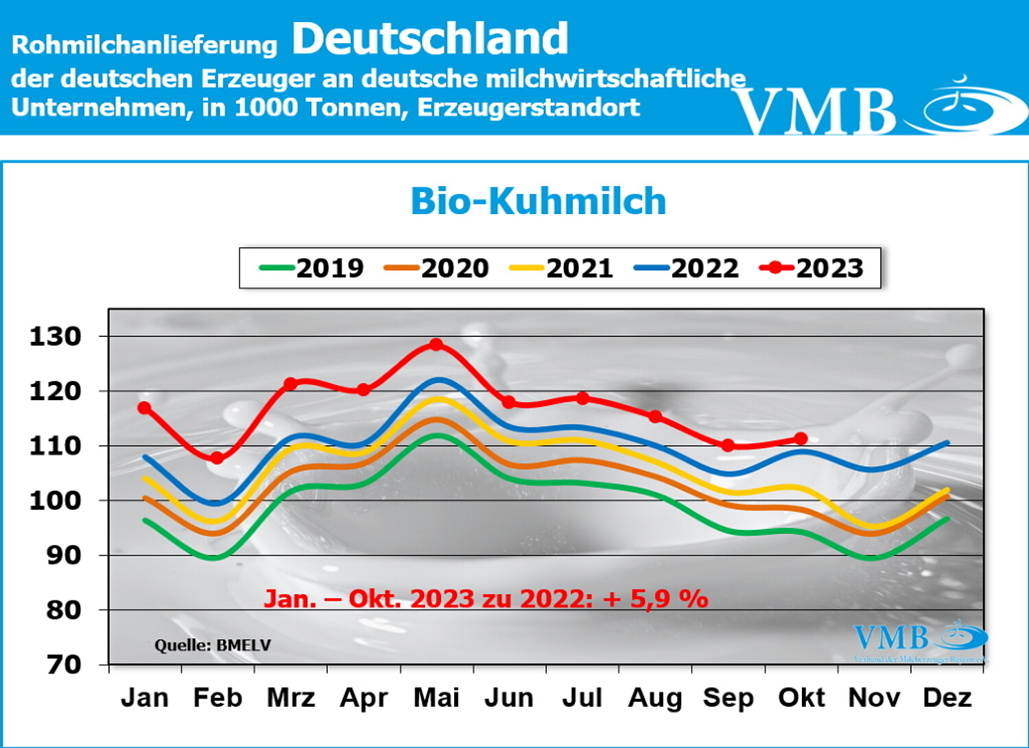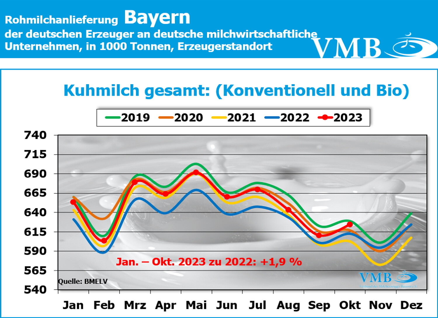 In der Tendenz bleibt die ökologisch/biologische Milcherzeugung, wie seit vielen Jahren, weiter monatlich ansteigend. Allerdings ist die Dynamik der vergangenen Jahre zurückgegangen und ist heuer bereits von anfänglich acht Prozent Steigerung auf zwei Prozent im Oktober 2023 abgefallen. Es hat den Anschein, dass jetzt in der Produktion bei Biomilch die Luft etwas heraus ist. Trotz der nachlassenden Milcherfassung hat die Gesamterzeugung nach zehn Monaten immer noch einen Vorsprung von fast sechs Prozent erreicht. Die Jahresmilchmenge wird aller Voraussicht nach bei knapp fast 1,4 Milliarden Kilogramm Milch liegen. Die bayerische Biomilcherzeugung verhält sich ähnlich wie auf Bundesebene. Die Anlieferung im Oktober 2023 blieb bei drei Prozent wie auf Linie der letzten vier Monate. Die vorläufige Jahresmilchmenge beläuft sich auf einen Wert von 573 Millionen Kilogramm Milch. Bei Beibehaltung der letzten Monatswerte könnte die bayerische Biomilchanlieferung noch bei knapp 800 Millionen Kilogramm landen. Damit wird die Biomilch in Deutschland zur Hälfte wieder von Bayern erzeugt.