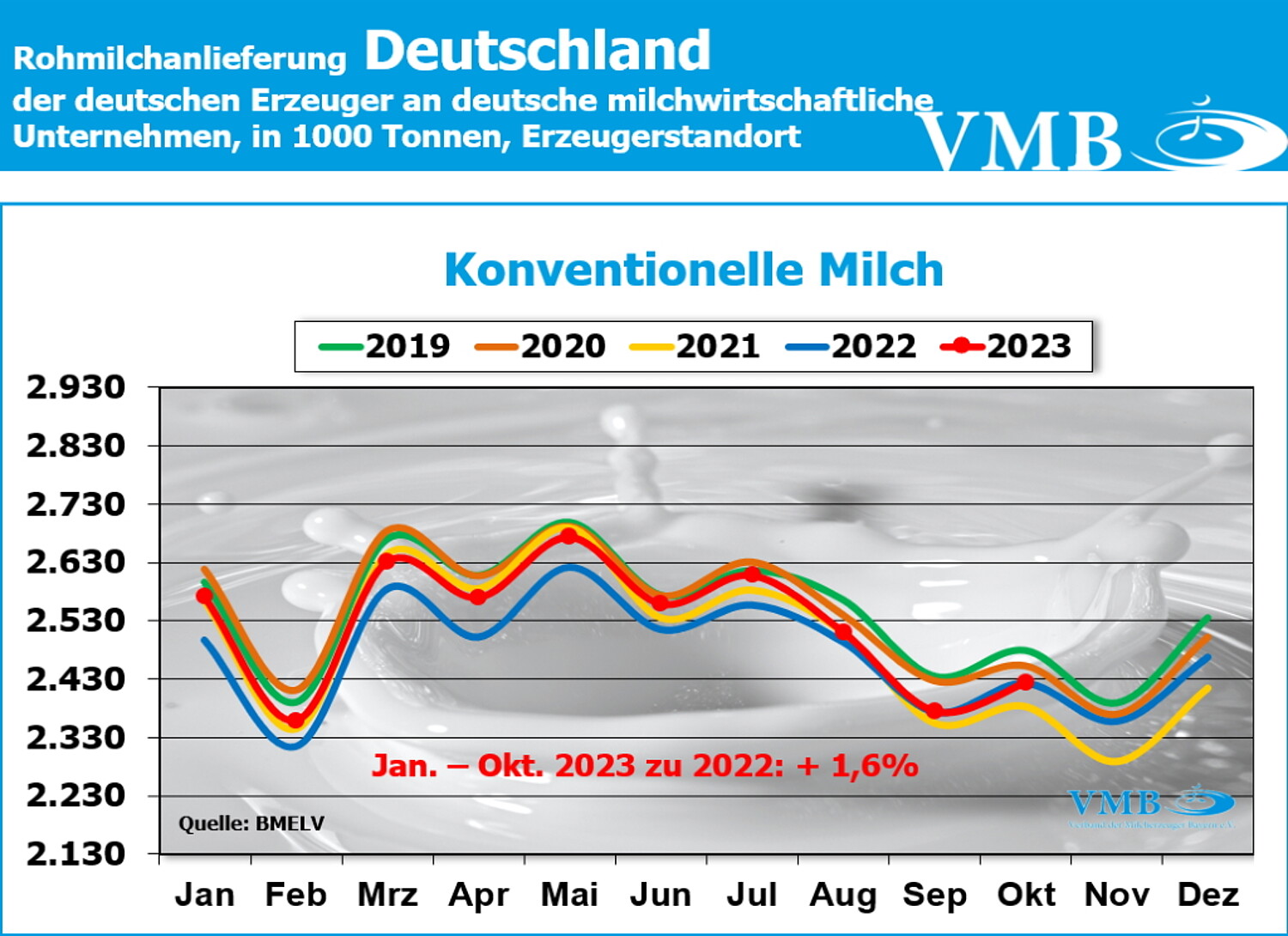 Die Statistik der deutschen Milchanlieferungsmenge, bekanntgegeben von der Bundesanstalt für Landwirtschaft und Ernährung (BLE), verzeichnet seit einem Jahr eine ausgedehnte Milcherzeugung mit teilweise erhöhten Werten. Mit dem aktuellen Mengenergebnis hat sich der anfängliche Trend einer Milchmengenanpassung auf Vorjahreslinie bestätigt. Auch der Oktober 2023 bleibt ohne Veränderung zum Vorjahr. Allerdings differenziert die Milchproduktion in den Bundesländern noch unterschiedlich. Die Abweichungsrate befindet sich zwischen Plus drei und Minus vier Prozent. Das veröffentlichte Milchaufkommen für die Gesamtmilchmenge (aus konventioneller und bio-/ökologischer Milch) für den Oktober 2023 beträgt 2,535 Milliarden Kilogramm. Der Vorsprung zum Vorjahresmonat liegt nun gerade noch bei 0,1 Prozent bzw. bei einem Plus von nur noch 3,5 Millionen Kilogramm mehr Milch im genannten Berechnungsmonat. Somit ergibt sich nach zehn Monaten des Kalenderjahres 2023 eine kumulierte positive Milchanlieferung von 1,8 Prozent. Insgesamt wurden daher 26,446 Milliarden Kilogramm von den deutschen Milchverarbeitern erfasst. Ein Volumenvorsprung von 467 Millionen Kilogramm Milch (Januar bis September 2023: 463 Millionen Kilogramm).