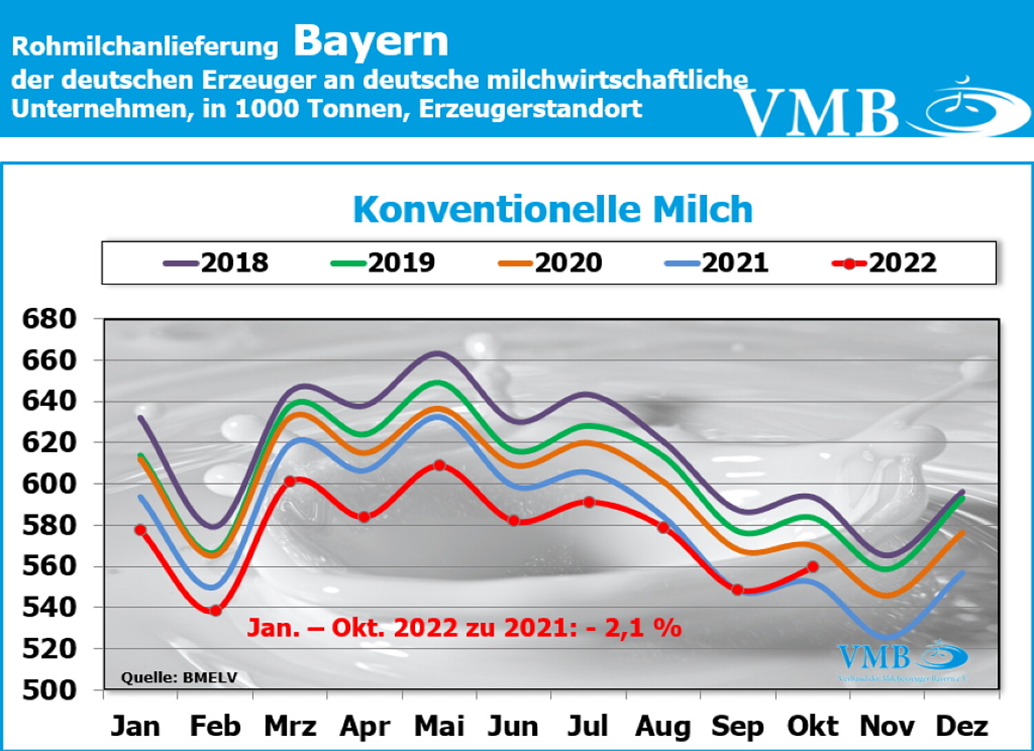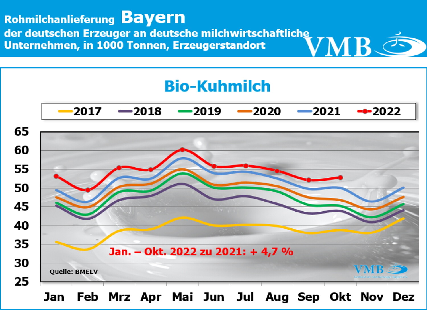 Das Biomilcherzeugungsniveau schreitet ungeachtet den derzeit begrenzten Vermarktungsmöglichkeiten weiter kräftig voran. Mit einem Plus von 6,1 Prozent wurde dieses Jahr der höchste Monatswert erzielt. Dies ergibt fortschreibend ein vorläufiges Gesamtaufkommen von 1,1 Milliarden Kilogramm Milch bzw. ein Vorsprung von drei Prozent. Nachdem nicht davon auszugehen ist, dass die Milcherzeugung im Biosegment in den letzten verbleibenden Monaten in 2022 unterbrochen wird, könnte die Jahresbiomilcherzeugung sich heuer durchaus über 1,3 Milliarden Kilogramm Milch befinden. Die bayerischen Zahlen zeigen sich analog der deutschen Auswertung. Daher wird in diesem Jahr eine Milchanlieferung von gut 650 Millionen Kilogramm Milch erwarten. Dies sind knapp fünf Prozent mehr als zu 2021.