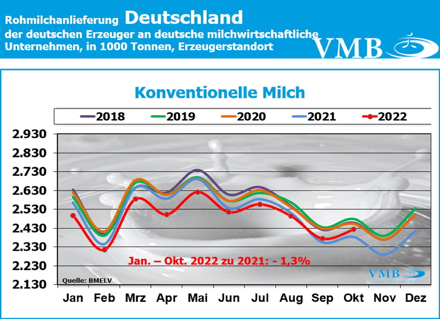 Die Statistik der deutschen Milchanlieferungsmenge, bekanntgegeben von der Bundesanstalt für Landwirtschaft und Ernährung (BLE), verzeichnet zum zweiten Mal in Folge in diesem Jahr eine Erhöhung in der Gesamtmilcherzeugung auf. Das Gros der Erhöhung ist dabei fast ausschließlich nur in Westdeutschland festzustellen. Die Biomilcherzeugung bleibt weiterhin positiv und meldet für den Oktober 2022 den höchsten Wert in diesem Jahr. Das veröffentlichte Milchaufkommen für die Gesamtmilchmenge (aus konventioneller und bio-/ökologischer Milch) für den Oktober 2022 beträgt 2,531 Milliarden Kilogramm. Der Anstieg zum Vorjahresmonat liegt nun etwas „kräftiger“ bei 1,9 Prozent, sodass in Summe 46 Millionen Kilogramm Milch mehr angeliefert wurde.