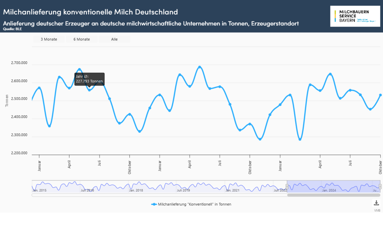 Die Milchanlieferung hat im Oktober deutschlandweit weiter aufgeholt und in diesem Jahr bisher den stärksten Mengenanstieg zur Vorjahreslinie genommen. Mit einer Milchanlieferung von insgesamt 2,65 Milliarden Kilogramm (konventionelle und bio/ökologische Erzeugung) stand zum Vorjahresvergleich ein um 6,7 % oder 168 Millionen Kilogramm größeres Milchaufkommen zur Verfügung. Der Rückstand von Januar bis Juli wurde durch die seit August vorherrschende expansive Milchanlieferung ausgeglichen. Mit einer kumulierten Menge von 26,33 Milliarden Kilogramm lag das Ergebnis gleich auf zum Vorjahreswert (schalttagsbereinigt).