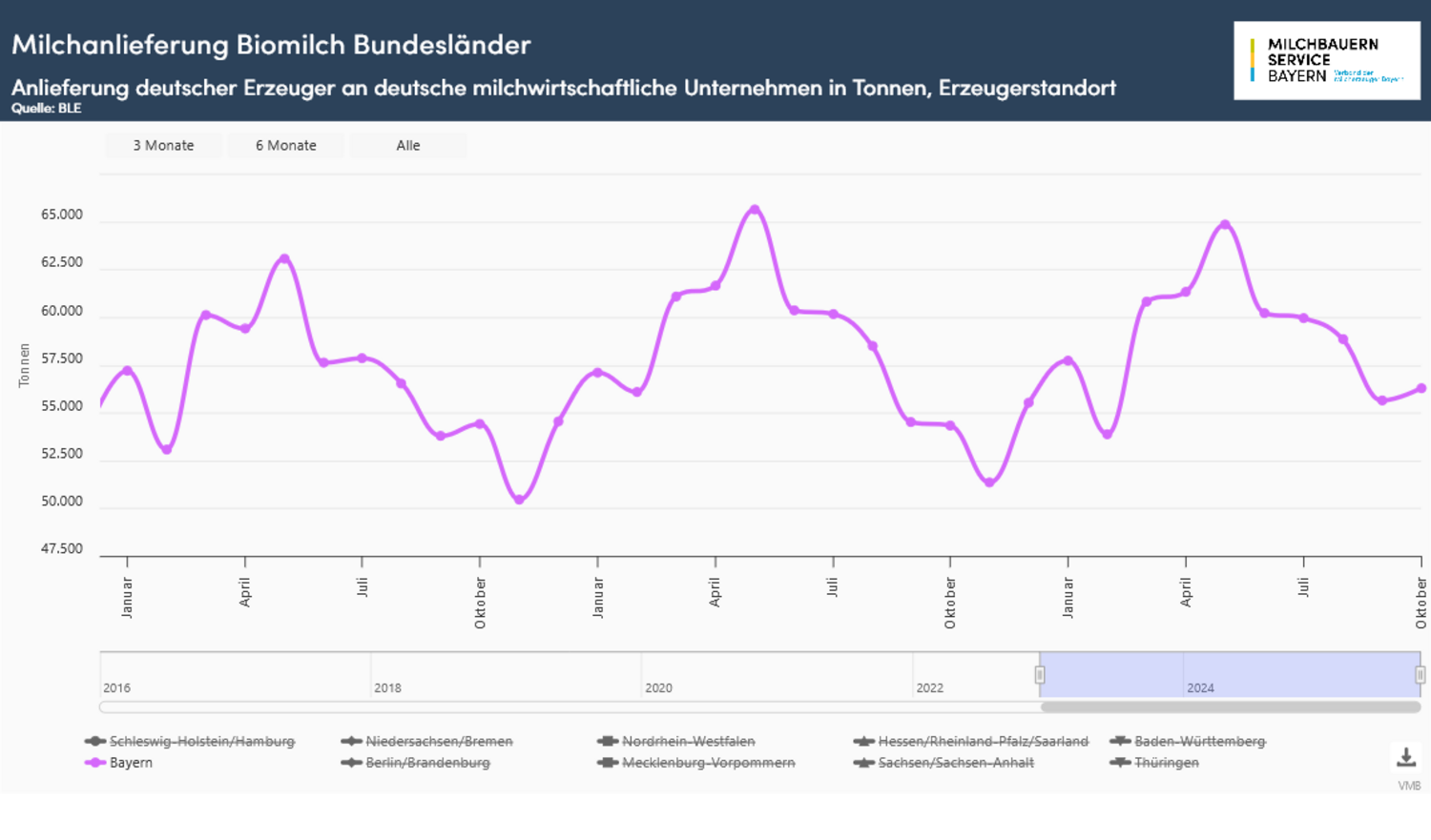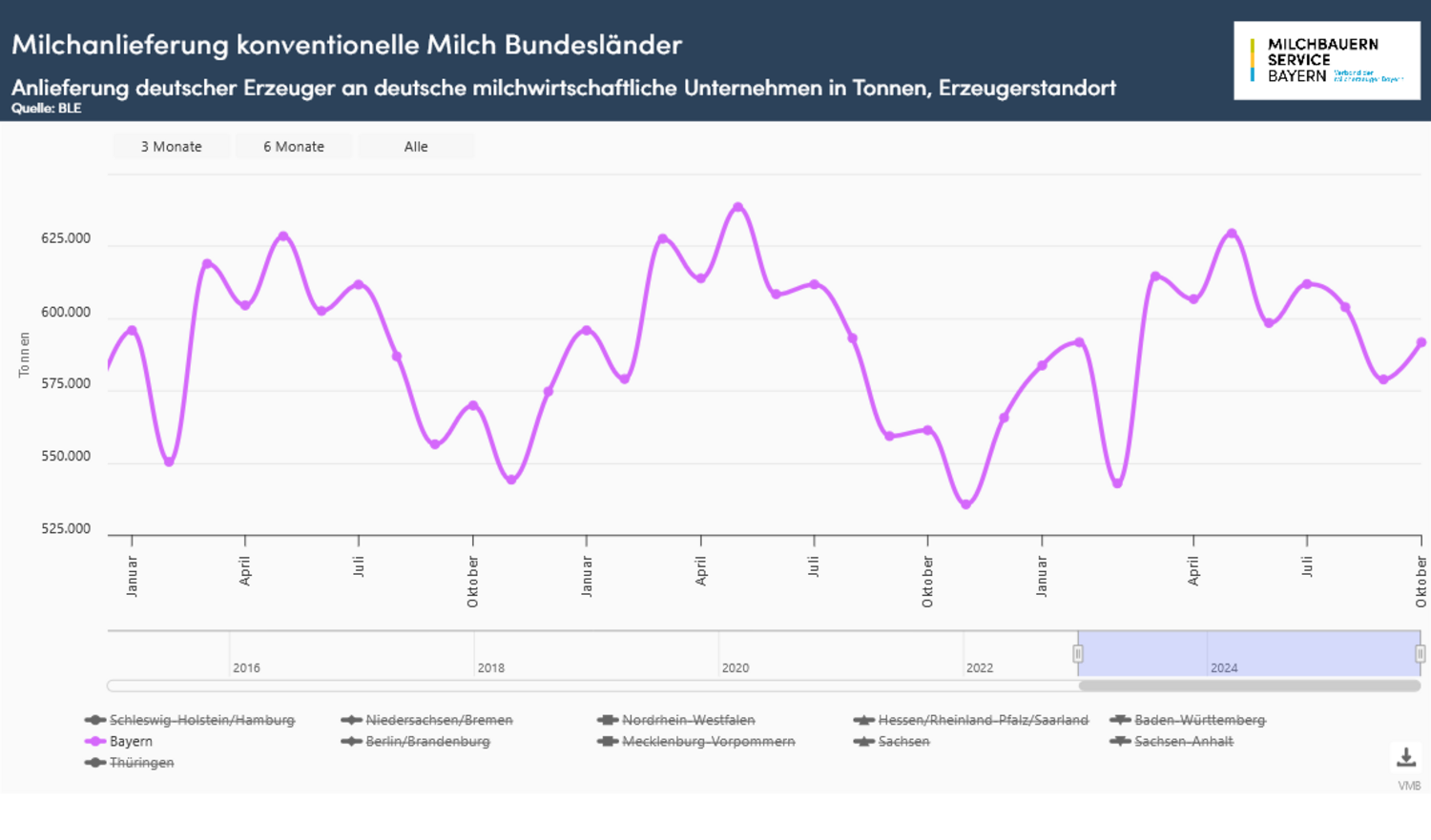 Innerhalb der einzelnen Bundesländer zeigte sich vor allem in den Regionen, welche im Vorjahr sehr stark von der Blauzungenkrankheit betroffen waren, die größten Mengensteigerungen zum Vorjahresmonat. In Niedersachsen bewegte sich die Milchanlieferung um 8,9 % und in Nordrhein-Westfalen um 7,4 % über dem schwachen Vorjahresergebnis. Die bayerischen Milchbauern erzeugten im Oktober um 5,4 % mehr Milch als noch vor einem Jahr. Auf bisheriger Jahressicht liegt die kumulierte Milchmenge nahezu gleich auf zu den ersten zehn Monaten des vergangenen Jahrs