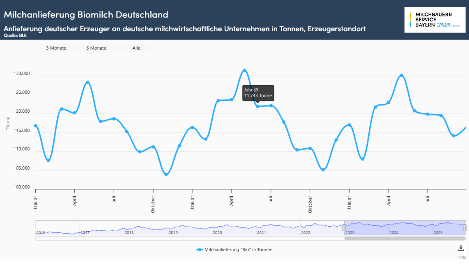 Die Milchanlieferung in der Bio-Milcherzeugung nahm im Oktober eine ähnliche Entwicklung wie am konventionellen Milchmarkt. Mit Ausnahme in den Erfassungsgebieten Thüringen und Berlin/Brandenburg entwickelte sich der positive Trend fort. Seit der Kehrtwende im August bewegte sich das bundesweite Erzeugungsniveau über der Vorjahreslinie. Deutschlandweit wurde im Oktober um 5,4 % mehr Bio-Milch erfasst als noch vor zwölf Monaten. Das entspricht den bisher stärksten Zuwachs im Jahresverlauf. Für den Zeitraum von Januar bis Oktober errechnete sich mit einer Anlieferungsmenge von 1,19 Milliarden Kilogramm ein moderates Plus von 0,3 % zum Vorjahreszeitraum. Aus Bayern wurde mit 56,28 Millionen Kilogramm um 3,6 % mehr Bio-Milch angeliefert als im Oktober 2024. Auf Jahressicht summierte sich das Milchaufkommen bisher zu einem Plus von 0,4 %.