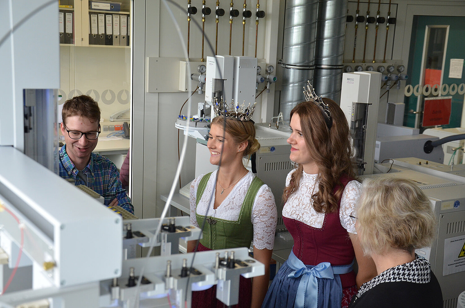 20. Oktober 2022 | Obligatorisch war der Besuch der Bayerischen Milchhoheiten im Milchwirtschaftlichen Zentrum Bayern in Kempten. Träger des Milchwirtschaftlichen Zentrums mit den Einrichtungen muva kempten, Spitalhof, Lehr-, Versuchs- und Fachzentrum für Molkereiwirtschaft (Molkereischule) ist der Milchwirtschaftliche Verein Bayern. Die muva kempten GmbH bildet das Herzstück dieses Kompetenzzentrums der Milch- und Landwirtschaft. Sie ist ein modernes Dienstleistungsunternehmen mit einem sehr breitgefächerten Angebot an Qualitätsberatungen und Laboruntersuchungen für die Milch- und Lebensmittelwirtschaft. Die Tätigkeits- und Kompetenzschwerpunkte umfassen vor allem die Wertschöpfungskette der Milchprodukte in Verbindung mit anderen Lebensmitteln, einschließlich der Einflüsse aus dem Vorfeld der Lebensmittelproduktion und der Verpackung. Geschäftsführerin Dr. Monika Knödlseder führte Veronika Gschoßmann (Bayerische Milchkönigin) und Philomena Mögele (Bayerische Milchprinzessin) durch die Räume und erklärte Details zu Analytik. Sensorik und HACCP-Konzepten. Ausserdem freute sich Geschäftsführer Clemens Rück vom Milchwirtschaftlichen Verein Bayern, den Milchhoheiten das Areal und die Einrichtungen des Milchwirtschaftlichen Zentrums zu zeigen.