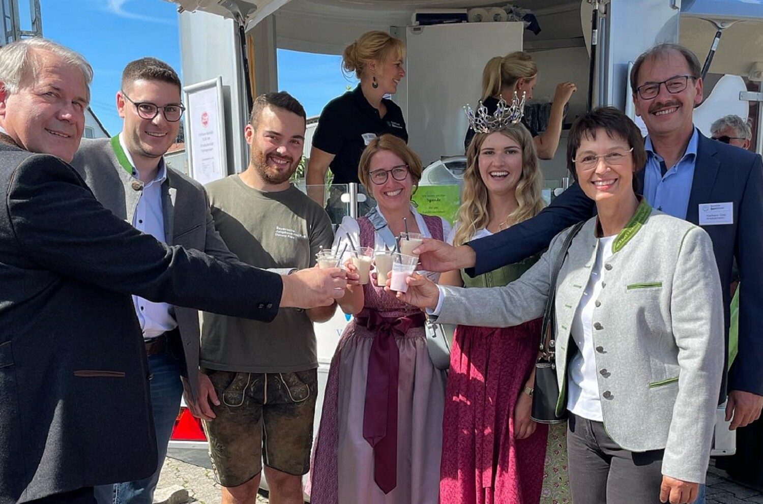 Nach sechsjähriger Pause fand vom 30. August bis 03. September 2023 die 19. Donau-Riesausstellung in Donauwörth statt. Der Bayerische Bauernverband hat eigens für die Ausstellung wieder ein Tierzelt organisiert, um den Besuchern kleine und große Tiere näher zu bringen, und über moderne und nachhaltige Landwirtschaft zu informieren. Ein besonderes Highlight war die VMB-Milchkanne. Die Landfrauen mixten hier leckere Milchcocktails zum Verkosten an die Ausstellungsbesucher. Am Samstag, den 2. September besuchte auch die Bayerische Milchkönigin Veronika Gschoßmann die Ausstellung, um dort im direkten Gespräch mit den Verbrauchern für Milch Werbung zu machen. Erster Anlaufpunkt war natürlich die Milchkanne und das Tierzelt. Dort traf sie sich zu einem Gespräch mit regionalen Politikern und Vertretern des Bayerischen Bauernverbandes und ließ sich anschließend die leckeren Milchshakes schmecken.