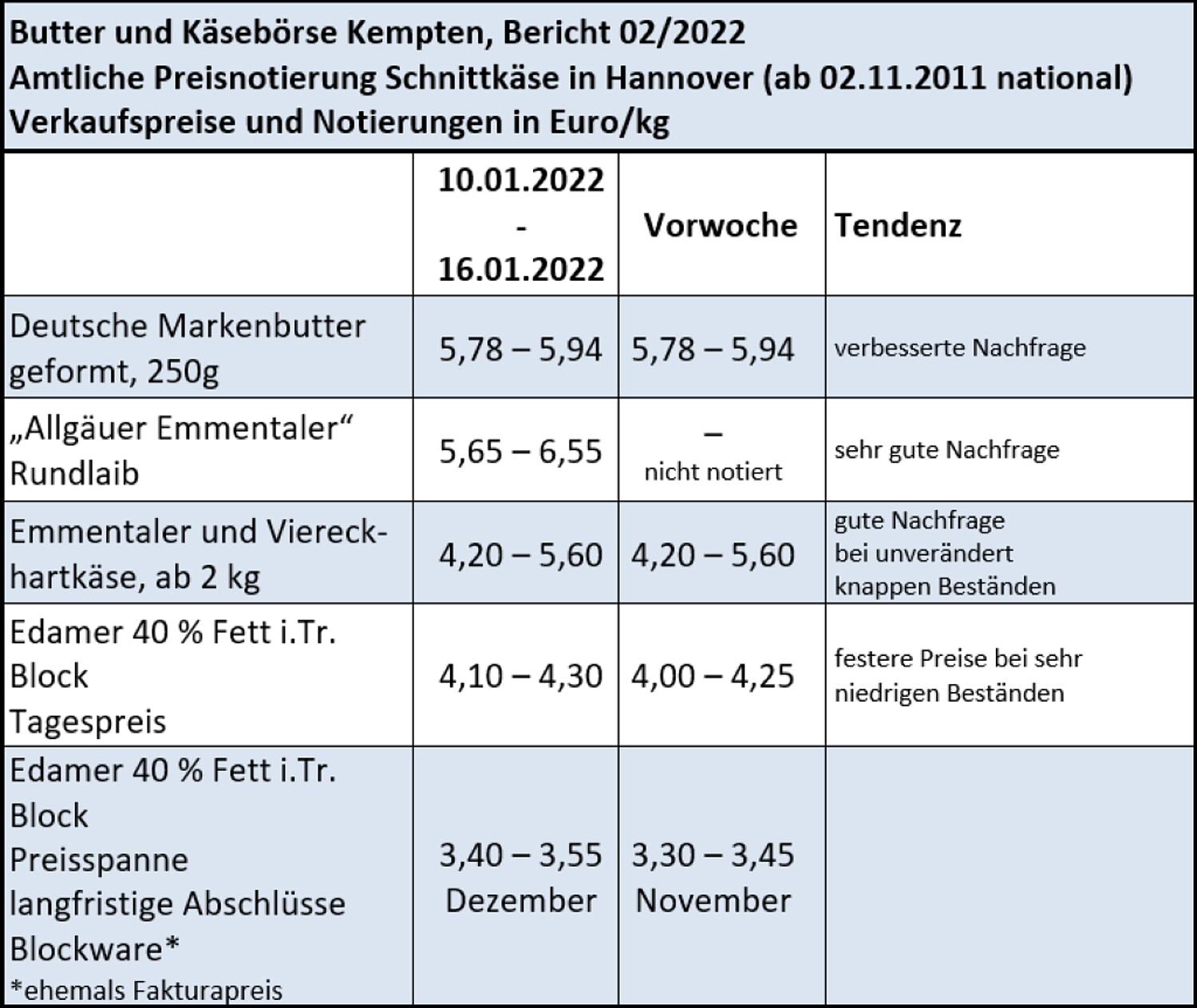 Das Verkaufsniveau von Käse allgemein, aber im Speziellem von Hartkäse, hat sich Mitte des Monats Januar gut behauptet. Allgäuer Emmentaler Rundlaibe, Viereckware und auch die Viereckhartkäse werden vom Handel zügig geordert. Neben dem Lebensmitteleinzelhandel werden inzwischen auch vom Großhandel sowie aus dem Exportbereich ansprechende Mengen nachgefragt. Da die Produktion von Emmentaler noch immer im, der Nachfrage, angepassten Modus erfolgt, lassen sich weiterhin feste Preise erzielen, jedoch können Preiserhöhungen nicht ausgeschlossen werden.