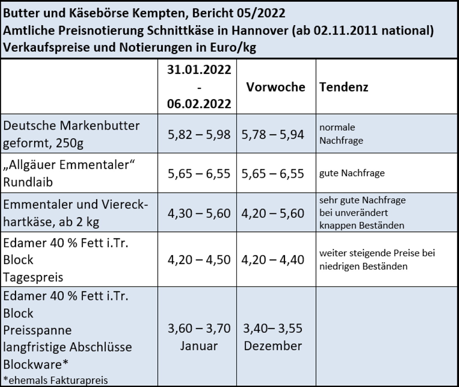 Die Verkaufsmengen von Schnittkäse weisen noch immer in ihrer Positionierung einen sehr ansprechenden, freundlichen Trend auf. Demzufolge zeigt der Absatz von Gouda, Edamer und den Schnittkäse-Spezialitäten ein hohes Niveau. Der Verkauf der Schnittkäseware über die Landesgrenzen hinaus, kann sich weiterhin als optimal präsentieren. Seit dem Herbst 2021 erfolgt in Europa eine geringere Milchabgabe, während eine höhere Nachfrage vor allem aus den EU-Nachbarstaaten besteht. Diese Marktkonstellation unterstützt auch die heimische Schnittkäsevermarktung. Der gegenwärtige Absatz verschafft den Vermarktern eine verbesserte Marktposition, so dass die Handelspreise von Schnittkäse weiter nach oben angepasst werden können.