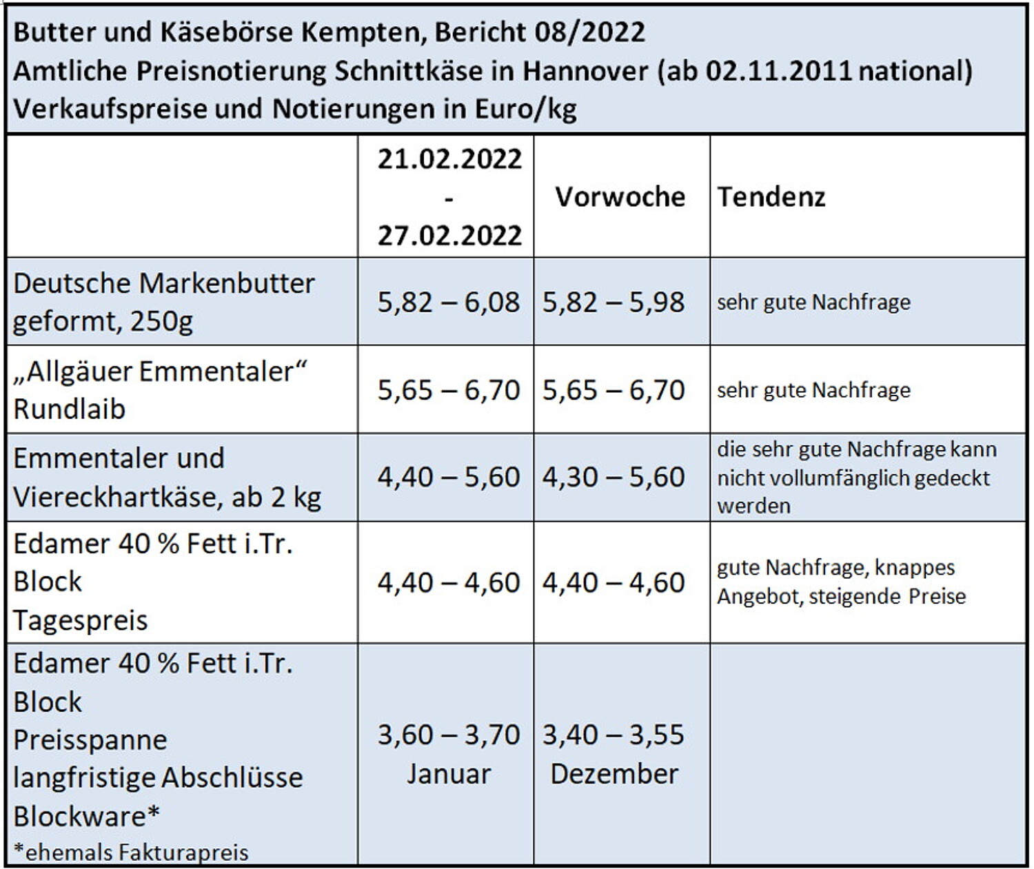 Der Handel mit Butter trifft auf eine gute Nachfragebasis. Neben dem angeregten Interesse an Butterstückware über den Lebensmitteleinzelhandel konnte gleichfalls bei Blockware ein zufrieden stellender Absatz von Seiten der Weiterverarbeiter gemeldet werden. Die Verkäufe bei Rahm und Sahne verlaufen ebenfalls ansprechend und konnten preislich ihr hohes Niveau beibehalten. Durch die guten Absätze und die erhöhten Rahmpreise in den letzten Wochen, lassen sich die von den Herstellern genannten Preiserhöhungen im nächsten Monat durchwegs umsetzen.