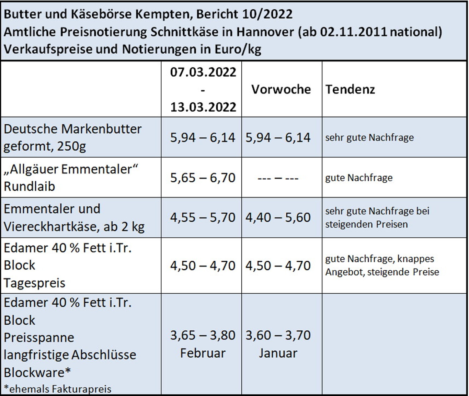Die Absatzmöglichkeiten an Butter sind weiter vielversprechend und nehmen bereits jetzt vor den Osterfeiertagen zu. Stück- wie Blockware wird zu festen Konditionen abgesetzt. Die Vermarktung von Rahm und Sahne ist gleichfalls zunehmend und wird zum Teil mit erhöhten Konditionen verkauft. Unter dieser Vorgabe ist daher nicht auszuschließen, dass sich auch die nächsten Butterkontrakte für die kommenden Monate erhöhen werden. Die gestiegenen Energiepreise werden hierzu mit beitragen!