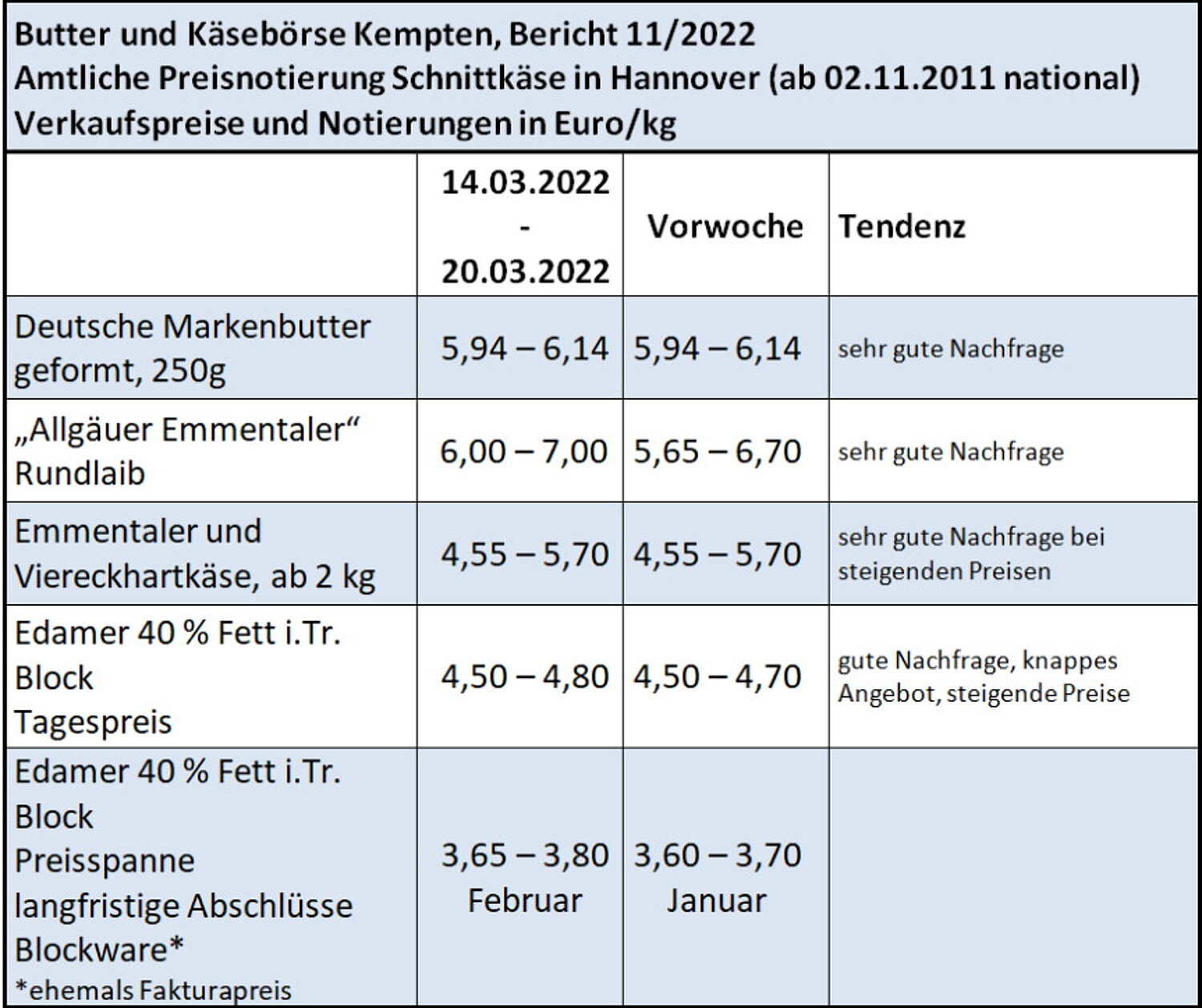 Eine weitere gute Umsatzentwicklung ist bei Hartkäse zu erwarten. Die Absätze im Großhandel als auch im LEH mit Allgäuer Emmentaler Ursprungsqualität und Emmentaler Viereckware, verzeichnen einen hohen Abverkauf und können zeitgleich auch im Ausland gut abgesetzt werden. Das Stimmungsbild im Handel ist fest geprägt, so dass mit anziehenden Erlösen zum Monatswechsel gerechnet wird. Die laufenden Kostensteigerungen vor allem im Energiebereich lassen auf größere Preissprünge hoffen.