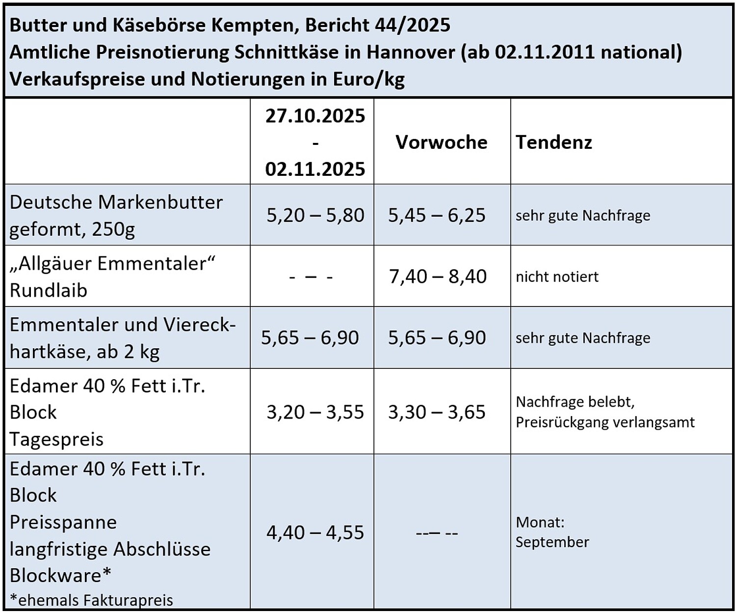 Im Handel mit Blockbutter beschränkte sich die Nachfrage vor allem auf Kontrakte für das neue Jahr. Der Geschäftsverlauf wurde insgesamt als ruhig beurteilt. Die Leitnotierungen wurden zwischen 10 und 20 Cent/kg reduziert.