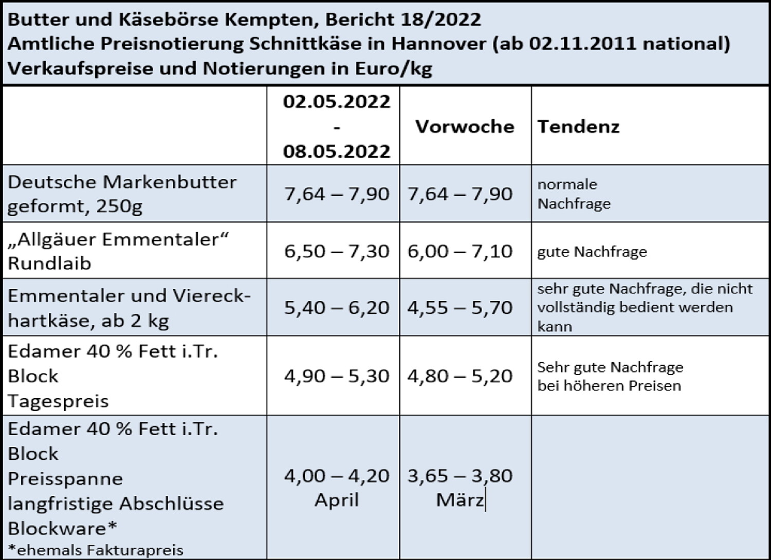 Das Absatzniveau bei Hartkäse in Allgäuer Emmentaler Ursprungsqualität als auch bei Emmentaler Viereckware hat sich zum Monatsbeginn erhöht. Gute Mengen werden im Inland wie auch für den Export gemeldet. Das Einkaufsinteresse ist hoch, da bei einer angepassten Produktion und steigenden Betriebsmitteln, Preisanhebungen unumgänglich geworden sind und somit noch vorhandene günstigere Angebote genutzt werden. Längerfristige Planungen für die Preisgestaltung und Absatzmöglichkeiten sind durch die derzeit wechselnden politischen und marktpolitischen Rahmenbedingungen schwierig geworden und schaffen eine Zeit bzw. den Beginn von unsicherer Verfügbarkeit der Betriebsmittel in der Milcherzeugung und Milchverarbeitung.