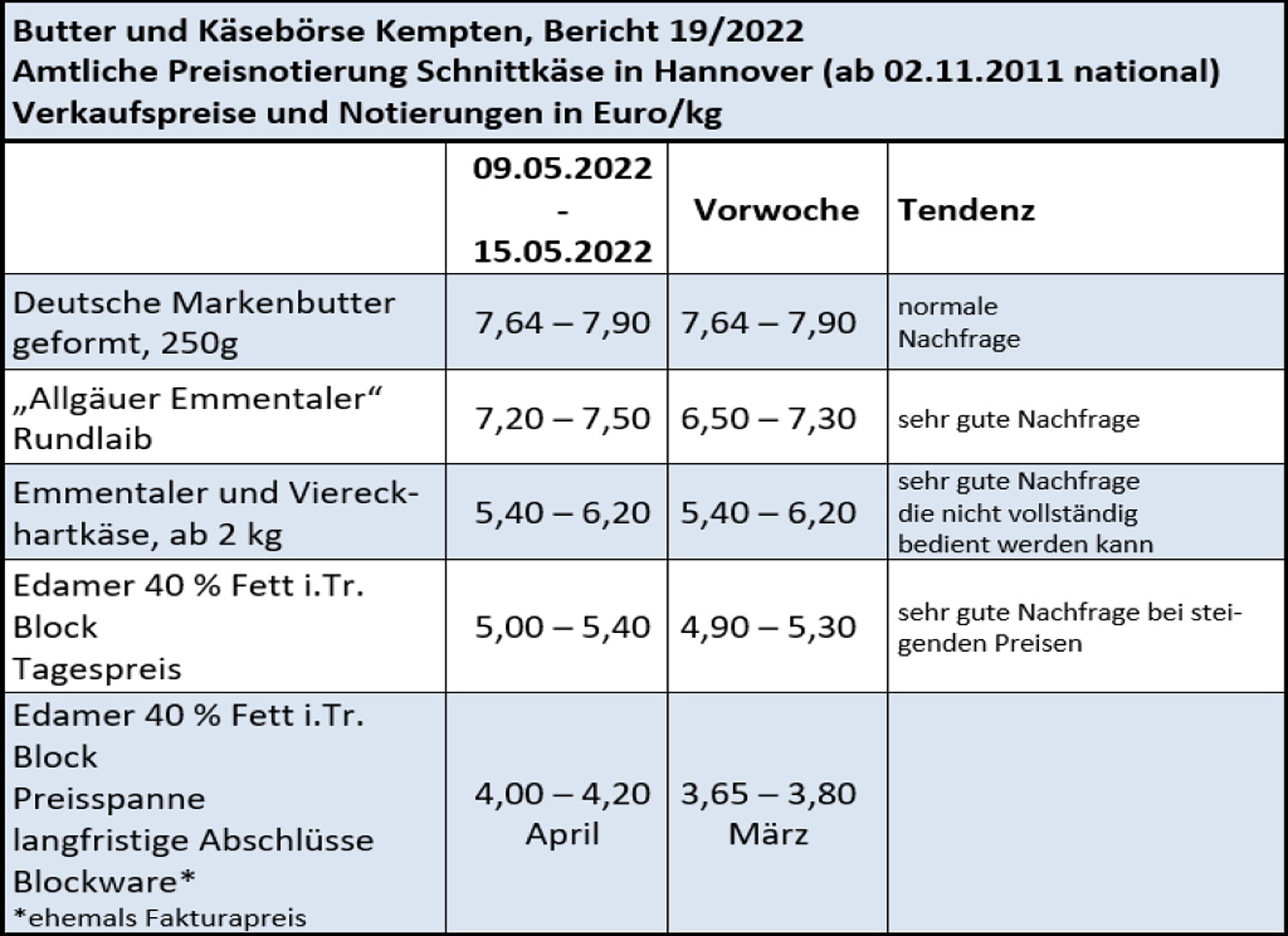 Das Geschäft mit Milchfett kann im gesamten als freundlich eingestuft werden. Die Verkäufe bei geformter Ware sind gleichbleibend und auch der Absatz an Rahm und Sahne ist zufriedenstellend. Der Bedarf an Butter und Sahne wird durch das frische Angebot an Spargel, Erdbeeren und der Eiscremesaison wesentlich beeinflusst. Blockbutter hingegen wird etwas verhaltener optioniert, da die Verarbeiter momentan durch die hohen Verkaufspreise angepasster bestellen. Entsprechend verläuft der Preistrend im Lebensmitteleinzelhandel fest und im Großhandel für Lebensmittelweiterverarbeiter rückläufig.