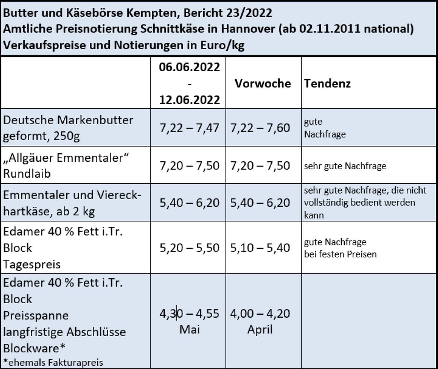 Die Verkäufe bei Hartkäse zeigen sich für die Jahreszeit im Absatz freundlich. Hartkäse mit Allgäuer-Ursprungsqualität werden gleich gut wie Emmentaler Viereckware abgesetzt. Der Lebensmitteleinzelhandel (LEH) ordert rege. Die Verkäufe über den Großhandel gehen gleichfalls gut voran, da die sommerliche Witterung die Biergartenbesuche ansteigen lassen. Das Exportgeschäft zeigt sich ebenfalls von einer belebten Seite. Die Marktkonstellation für Hartkäse ist für die Hersteller daher sehr ausgeglichen, sodass feste Konditionen genannt werden können.