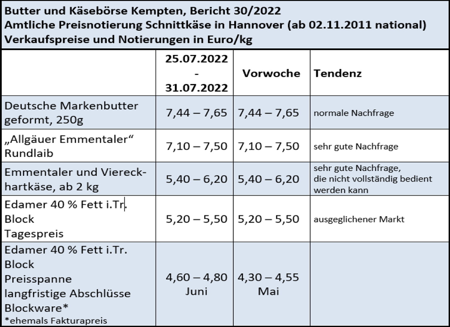 Der Handel mit Hartkäse ist für die Jahreszeit erstaunlich freundlich. Die Verkäufe im LEH bei Emmentaler mit 400 Gramm-Stück als auch aufgeschnittene und Stiftelware sind auf einer ansprechenden Höhe und gleichzeitig lief das Geschäft im Großhandel über Allgäuer Rundlaibe und auch bei Emmentaler Viereckware gut voran. Der Export für den EU-Binnenmarkt bleibt ebenfalls auf einer angeregten Höhe bestehen, sodass das Gesamtangebot an Hartkäse dem Bedarf angepasst gegenübersteht. Aus dieser Position heraus lassen sich hierdurch feste Preise erzielen.