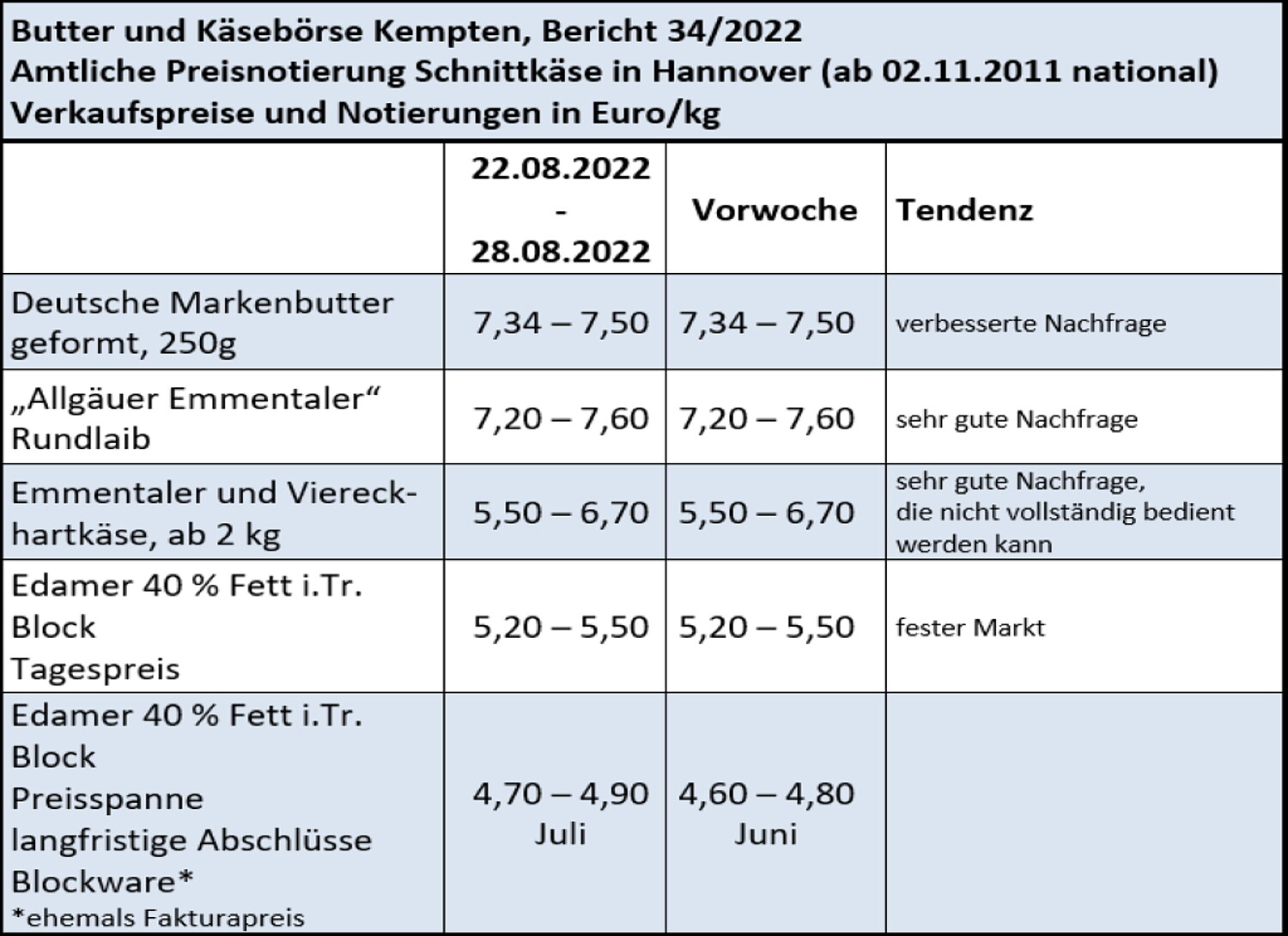 Der Verkauf mit Käse gelangt zunehmend in das Herbstgeschäft hin. Entsprechend steigern sich auch bei Hartkäse die Umsätze. Neben einem guten Nachfrageverlauf von 400 Gramm-Stücken als auch aufgeschnittene und Stiftelware über den Lebensmitteleinzelhandel (LEH), konnte der Großhandel zulegen. Hauptsächlich wird in diesem Bereich wegen den vielen und bekannten Volksfesten in Bayern, Allgäuer Emmentaler Rundlaibe nachfragt. Die ausgeglichene Angebots- und Nachfragestruktur eröffnet fest Preise zu benennen.