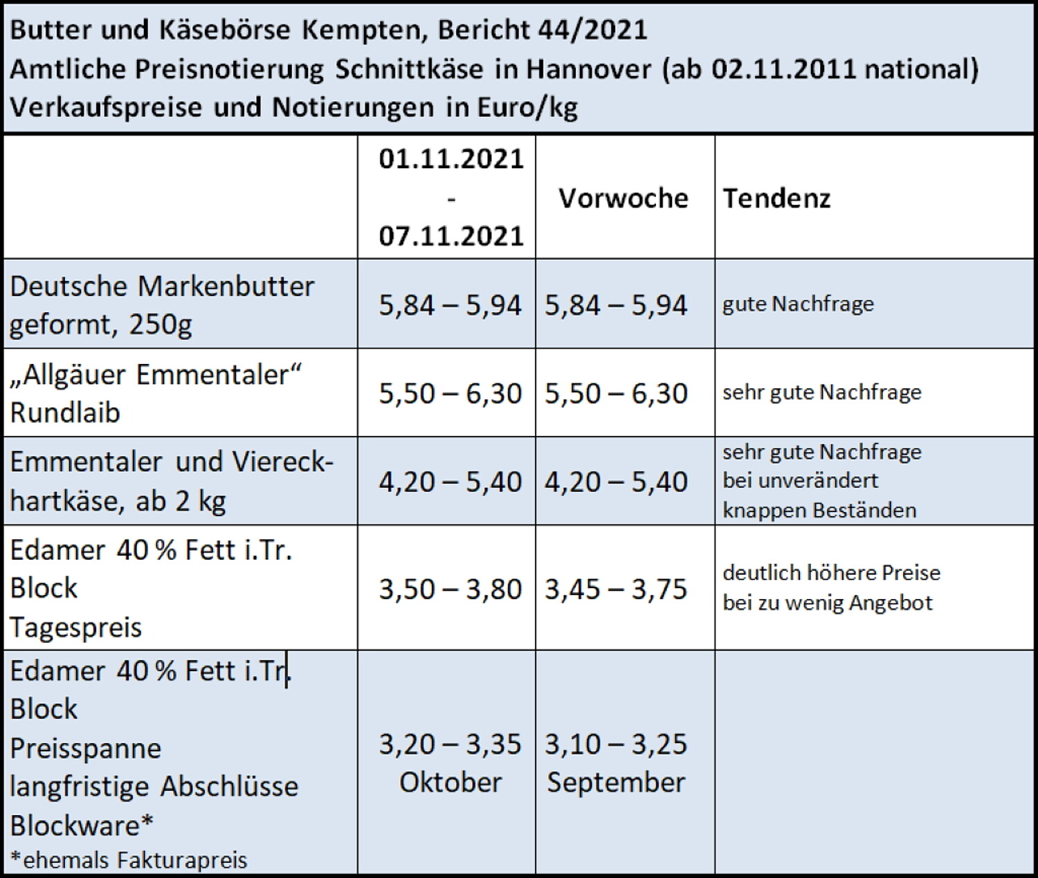 Die Absatzlage von Käse bleibt immer noch in einer allgemein freundlichen Ausrichtung. Auch bei Hartkäse können kontinuierlich gute Geschäfte realisiert werden, welche gleichermaßen im Inland aber auch im Ausland möglich sind. Die generell angepassten Marktverhältnisse im Käsesegment, insbesondere bei Hartkäse, verhelfen nun den Hartkäseproduzenten zu einer gefestigten Verhandlungsposition, so dass auch hier die Preisanpassungen etwas stärker ausgeprägt sind.