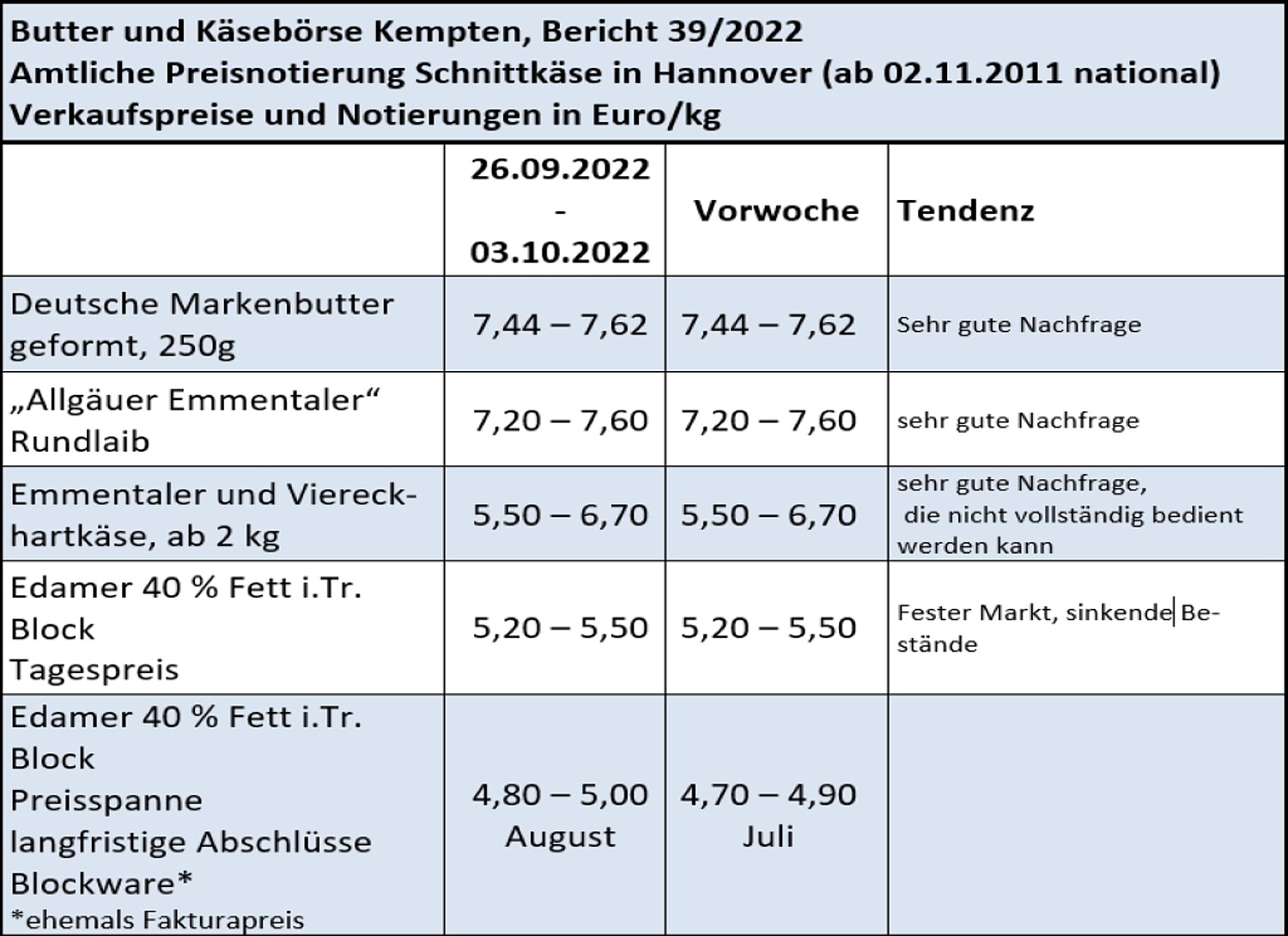 Die Handelsbilanz an Schnittkäse geht weiter sehr ansprechend voran. Die Sorten wie Edamer, Gouda und Spezialitäten wie Butterkäse und Tilsiter werden gleichgewichtet geordert, wobei ein höheres Kaufinteresse bei 40 %-iger Ware besteht. Das Geschäft in dieser Jahreszeit mit Schnittkäse über die Landesgrenzen hinaus ist weiter hoch, obwohl die Ferienzeit schon längst beendet ist. Vorzugsweise Italien hat durch die lange Trockenheit im Sommer zunehmend Bedarf an Käse zur Deckung der Eigenversorgung. Die angepasste Produktionshöhe bei Käse ermöglicht den Herstellern allgemein feste Preise zu benennen.