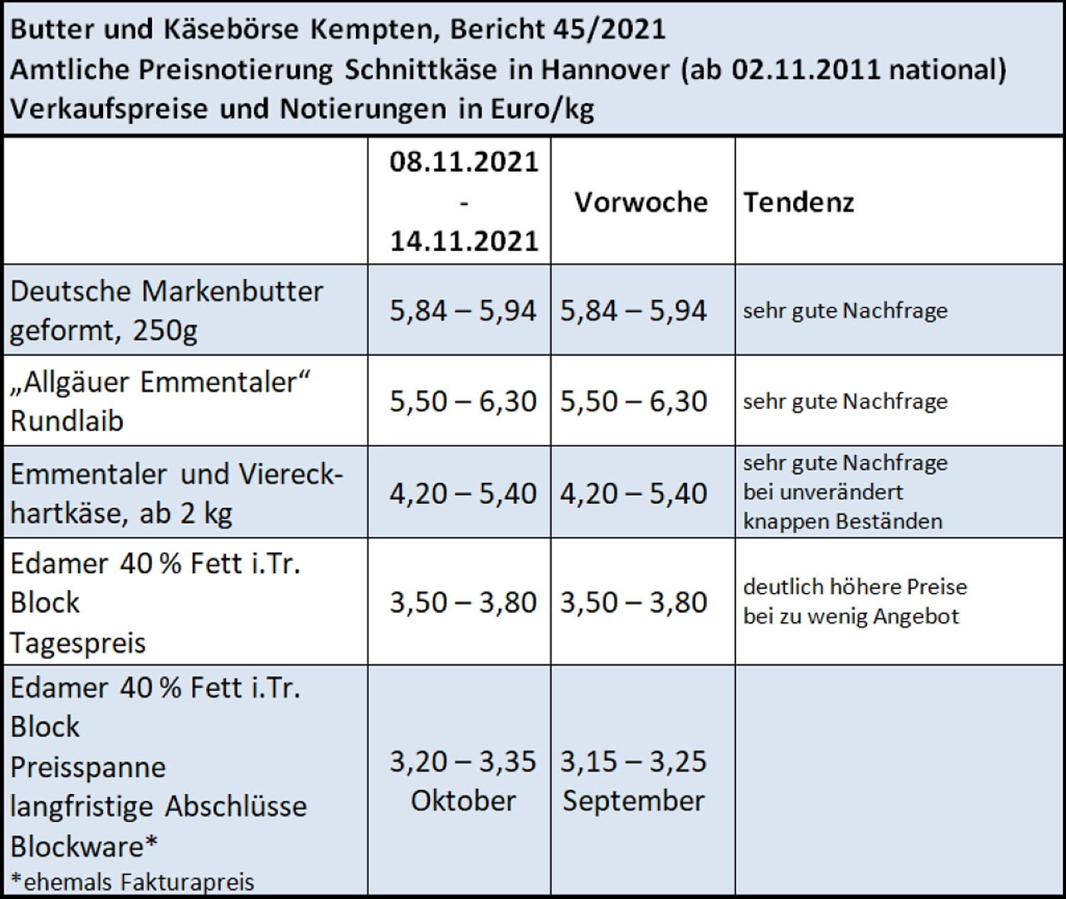 Wie für die Jahreszeit erwartet, können sich in der zweiten Novemberhälfte die Verkaufsbedingungen von Milchfett freundlich präsentieren. Die Nachfrage hat sich im Lebensmitteleinzelhandel erhöht, da doch inzwischen die privaten Haushalte Vorbereitungen für Weihnachten treffen und somit allmählich die Backsaison anfängt. Der Umsatz bei Butter in Blockform ist durch die geringere Verfügbarkeit der Ware äußerst klein geworden. Deshalb findet bei der Blockware der Handel hauptsächlich über den eingelagerten Vorrat statt. Der Absatz von Rahm hat sich gegenwärtig auf eine gute Verkaufsmenge eingependelt, so dass im Milchfettbereich, aufgrund der guten Marktentwicklung, derzeit feste Preiskonditionen genannt werden können.