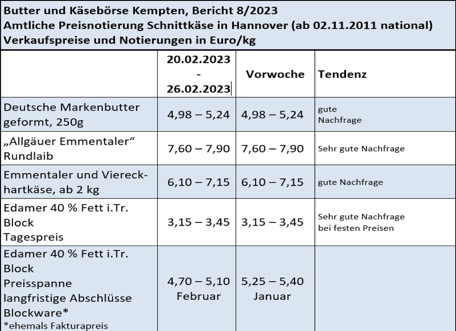Das Hartkäsegeschäft geht allmählich auch in den „Ostermodus“ über. Vom Lebensmitteleinzelhandel (LEH) und Großhandel gehen wieder mehr Anfragen ein. Bei Allgäuer Rundlaibe und Blockware sowie Viereckware sind gute Absätze vorhanden und können somit das Marktgeschäft ausgleichen. Die Vermarktung ins Ausland hat ebenfalls eine freundliche Richtung erreicht. Hieraus konnten sich Verkaufspreise für Hartkäse behaupten.