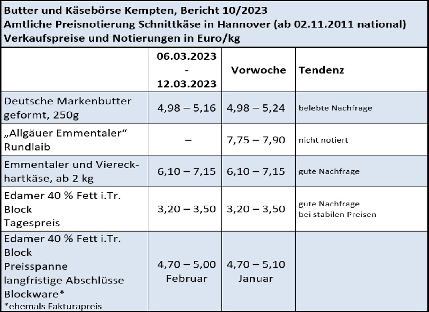 Das Handelsvolumen bei Hartkäse kann sich tendenziell wie bereits in den vergangenen Wochen noch gut halten. Allgäuer Emmentaler Ursprungsqualität und Emmentaler Viereckware werden im Lebensmitteleinzelhandel (LEH) freundlich abgesetzt. Gleichzeitig konnte der Export noch zufrieden stellen. Durch das derzeit marktkritische Umfeld bei den Handelspreisen für Butter und Schnittkäse, drängen die Käufer verstärkt darauf, bei den nächsten Kontraktverhandlungen eine gewisse Abgleichung erzielen zu „müssen“.