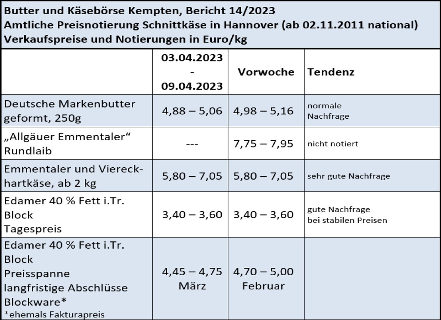 Das Schnittkäsesegment läuft bei abgesenkten Verkaufspreisen wieder reger voran. Edamer, Gouda und Schnittkäsespezialitäten wurden daher über die Osterfeiertage ansprechend geordert. Die Exporte haben allgemein auch zugelegt, obwohl über die Feiertage das Absatzvolumen südlich des Brenners etwas nachgelassen hat. Die Preisentwicklungen sind nach einer stärkeren Anpassung gleichbleibend, aber auch hier wird weiter stetig das Niveau angesprochen.