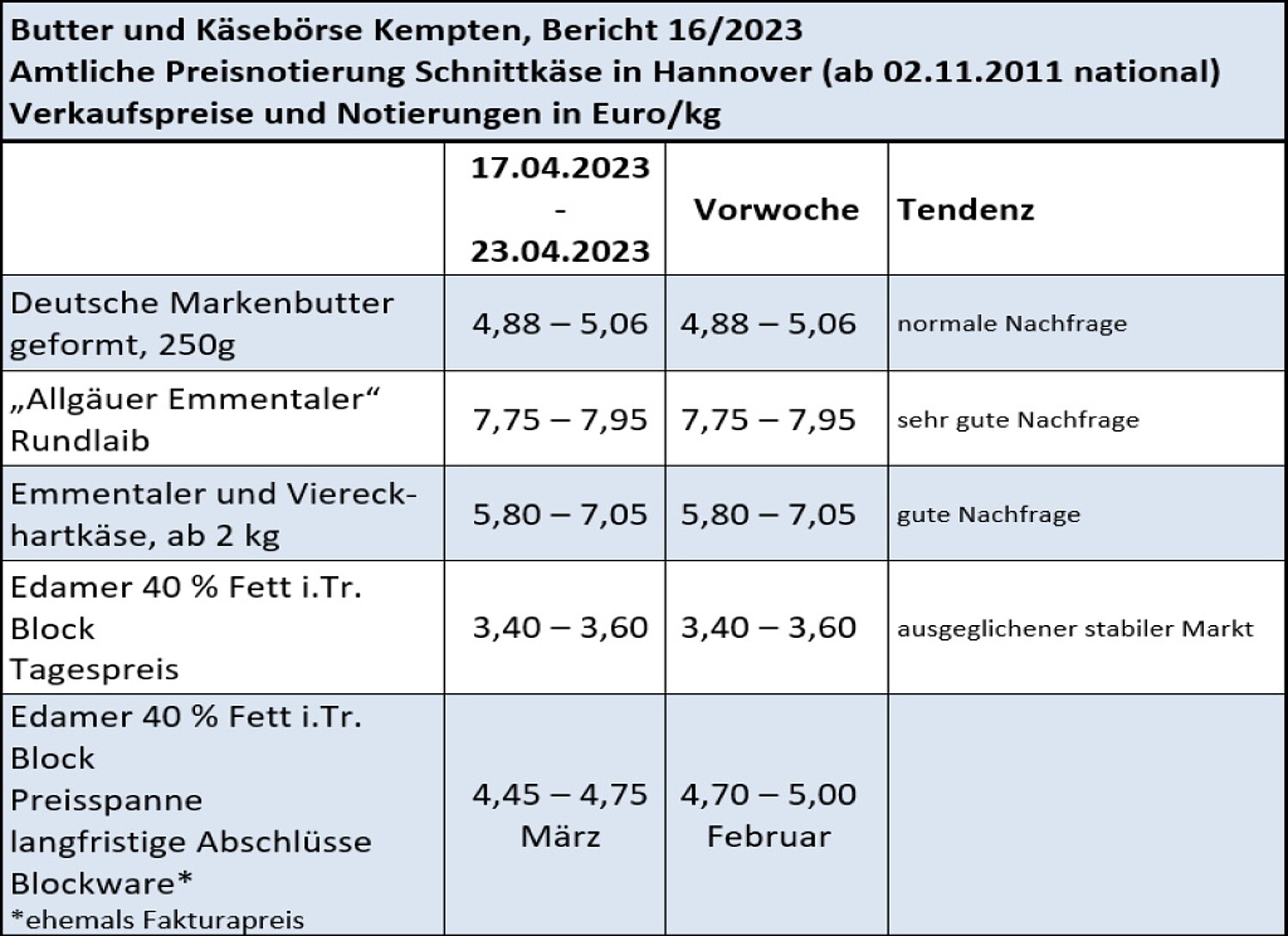 Die Handelsmenge für Hartkäse verlaufen für den April im Übergang in den Mai weiter im normalen Umfang im Vergleich der letzten Jahre. Im Lebensmitteleinzelhandel als auch für den Export ist keine Belebung so richtig zu erkennen. Die noch verhaltene Nachfrage könnte auch der Ursache geschuldet sein, weil für Hartkäse noch neue Kontraktgespräche geführt werden und mit dem Ausgang der Vertragsgespräche erst dann die entsprechenden Volumen geordert werden. Die aktuellen Preise sind weitestgehend unverändert geblieben.