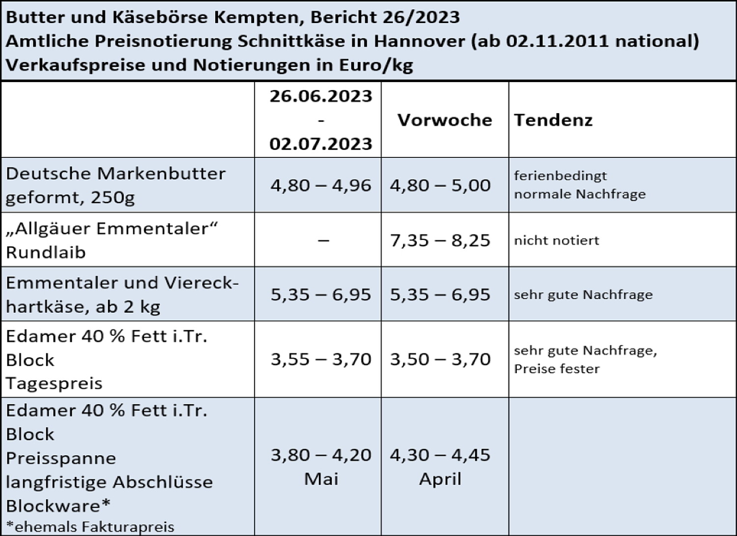 Die georderten Mengen bei Hartkäse können derzeit zufriedenstellen. Trotz der anstehenden Ferienzeit werden über den Lebensmitteleinzelhandel (LEH) und im Großhandel Allgäuer Rundlaibe und Allgäuer Viereckware als auch Emmentaler Blockware ansprechend abgerufen. Neben guten Exportgeschäften sind die Verkäufe auch zur weiterverarbeitenden Industrie bzw. Aufschneidern freundlich. Das Preisniveau zeigt sich daher auf einer stabilen Basis und bleibt unverändert zu den vorangegangenen Wochen.