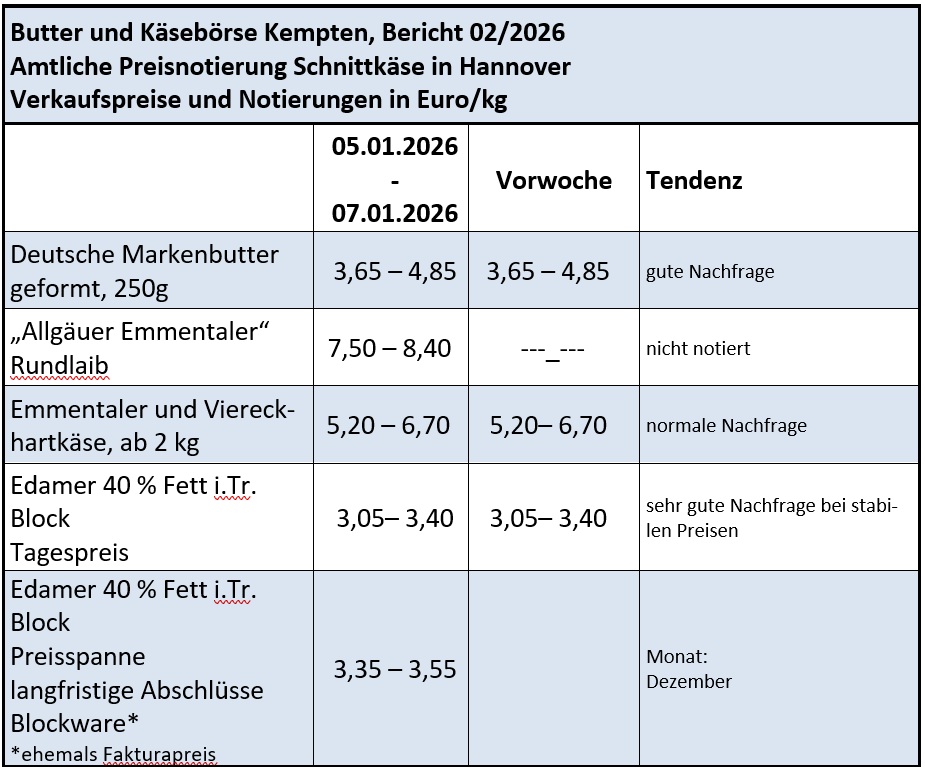 Nach einem außergewöhnlich hohen Mengenumsatz mit abgepackter Butter zum Weihnachtsgeschäft und einer preisbedingt lebhaften Verbrauchernachfrage seit September des vergangenen Jahres, hatten sich die Bestellungen in den ersten Handelswochen des neuen Jahres erwartungsgemäß normalisiert und entwickelten sich etwas ruhiger. Die Absatzmengen hatten gleich wohl ein ansprechendes Niveau eingenommen. Die Molkereiabgabepreise notierten mit 3,65 bis 4,85 Euro/kg unverändert. Im Handel mit Blockbutter entwickelte sich mit dem Jahresbeginn ein anziehendes Kaufinteresse. Die Kurse an der Kemptner Leitnotierung konnten sich dabei befestigen.