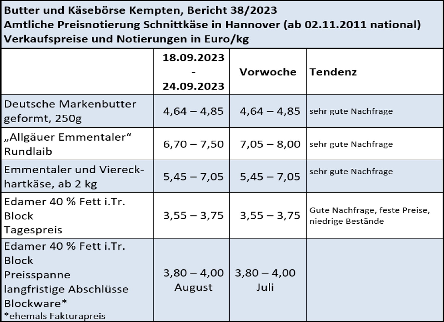 Wie gewohnt zum Herbstbeginn gehen auch die Geschäfte mit Milchfett gut voran. Der Verkauf bei Block- und besonders bei Stückware kann mit ansprechenden Mengen aufwarten. Bei gutem Handelsumfang konnten die Erlöse gleichbleibend gehalten werden. Gleichfalls haben sich die Umsätze für Rahm und Sahne verbessert und erzielen, wenn sie vor allem über den Spotmarkt eingekauft werden, höhere Handelswerte.