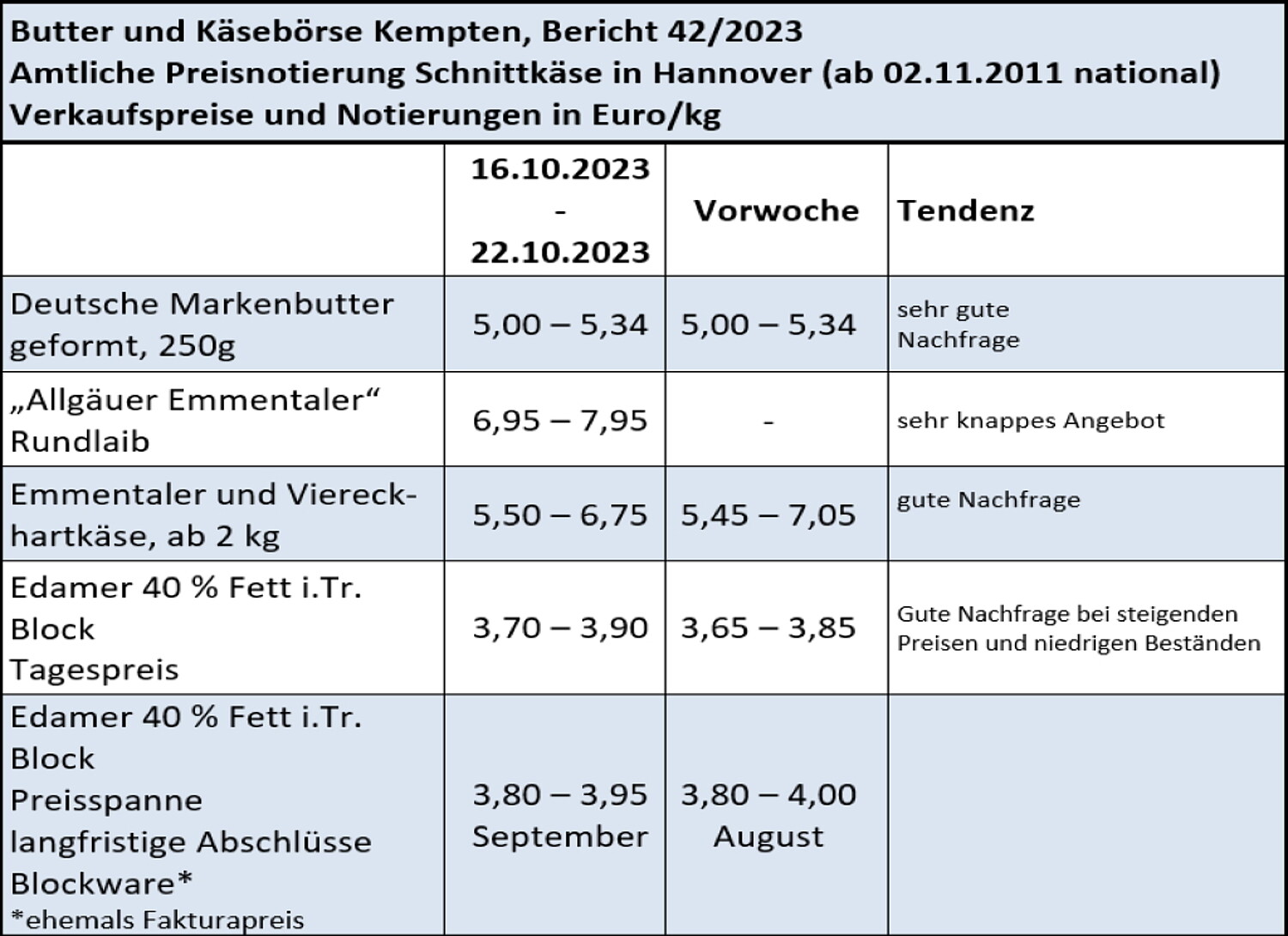 Nach anfänglichen Absatzschwierigkeiten bei Schnittkäse zu Jahresbeginn nehmen jetzt zum Herbst die Aufträge zu. Die Nachfrage zum beginnenden Herbst- und Weihnachtsgeschäft erlebt einen Aufschwung mit gut gefüllten Auftragsbüchern. Die Geschäfte über den LEH, die Tagesgeschäfte und der Export entlasten den Markt, so dass die Bestandslage bei Edamer beider Fettsorten, Gouda und den Schnittkäsespezialitäten sehr der Auftragslage angepasst ist. Die Marktbasis verschafft den Käseherstellern etwas Freiraum, wodurch neuere Kontrakte leichte Preisverbesserungen einnehmen konnten.
