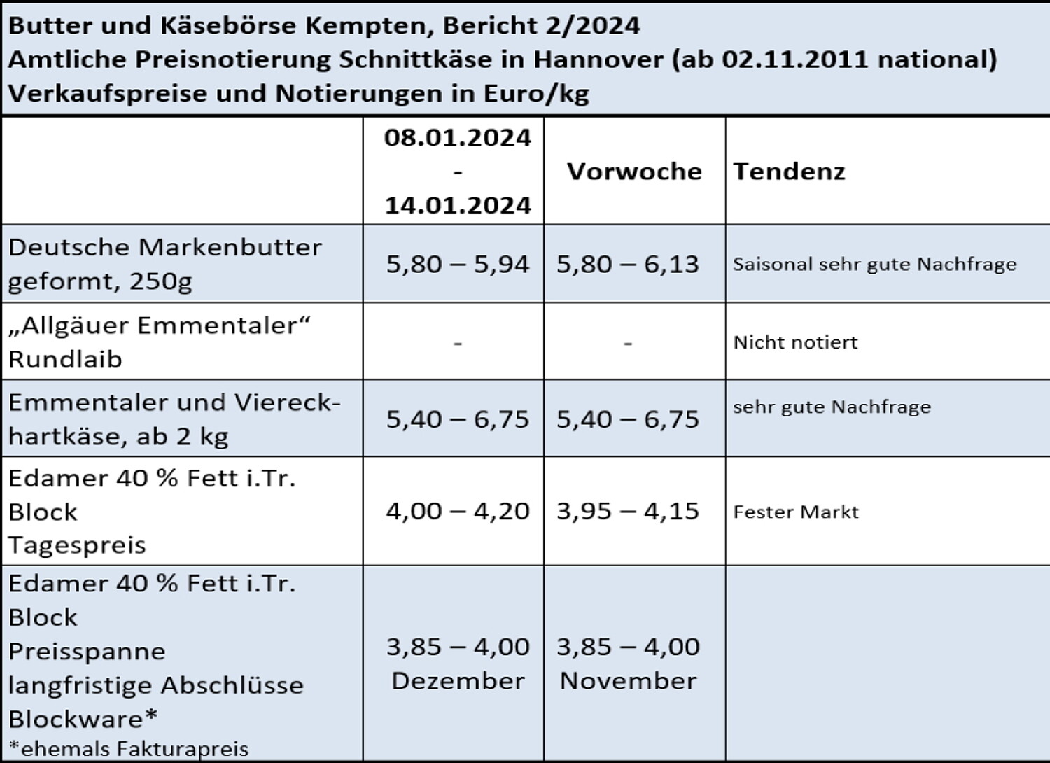 Der anfängliche „Nachfragedurchhänger“ zum Jahreswechsel für Milcherzeugnisse hat sich heuer nicht ganz bestätigt. Die jahreszeitlich tendenzielle Schwäche bei Schnittkäse bleibt außen vor und verzeichnet eher relativ gute Handelsmengen im Abverkauf bei Edamer beider Fettsorten, Gouda und den Schnittkäsespezialitäten. Neben dem ansprechenden Inlandsgeschäft gehen auch mittlerweile im Export freundliche Anfragen ein. Das Preisgefüge ist weitestgehend fest und im oberen Notierungsbereich wird auch häufiger schon die vier-Euro-Grenze überschritten.