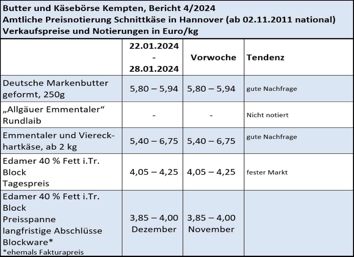 Bei einem weitestgehend ausgeglichenen Marktverhältnis entstanden kaum größere Veränderungen. Die Absatzschwäche nach den Feiertagen im LEH und Export dürfte überwunden sein, die Verkaufszahlen sollten sich dem Vernehmen nach bei einer verbesserten Nachfrage stabilisieren. Die Abgabepreise an den Großhandel notierten auf unveränderter Basis.