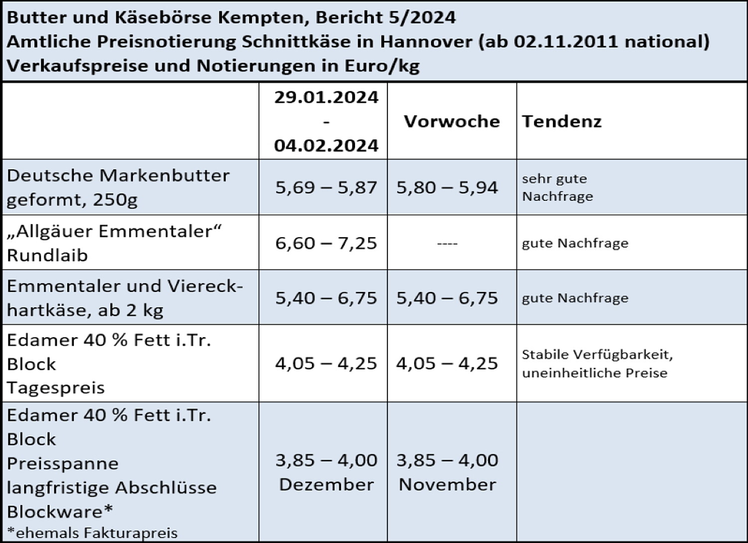 Nachdem bereits der Februar eingeläutet wurde, lässt sich nach gut vier Wochen für 2024 eine positive Bilanz in der Schnittkäsevermarktung ziehen. Die Absatzmengen sind für den Januar und im Übergang zur Faschingswoche recht ansprechend. Edamer beider Sorten, Gouda und auch die Schnittkäsespezialitäten werden über den LEH gut geordert. Im Export und über den Großhandel gehen ansprechende Anfragen ein. Die ausgewogene Marktkonstellation von Angebot und Nachfrage ermöglicht derzeit für Schnittkäse eine festere Preisbenennung.