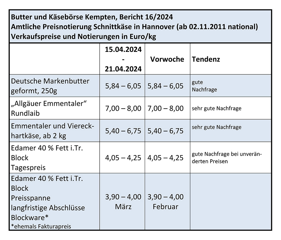 Die Absatzzahlen im Handel mit Hartkäse entwickelten sich freundlich. Ob von Seiten des LEH´s im Inlandgeschäft oder im Export, es wurde zunehmend Allgäuer Emmentaler und Emmentaler nachgefragt. Das Marktverhältnis zwischen Angebot und Nachfrage stellte sich weitestgehend ausgeglichen dar. Die Abgabepreise an den Großhandel für Allgäuer Emmenta-ler konnten im größeren Umfang zulegen. Für den weiteren Verlauf wird ein gutes Absatzpo-tenzial für Rundlaibe und Blöcken mit Ursprungsqualitäten auch im Zuge der Weiterverarbei-tung in Form für Stück-, Stiftel- oder Aufschnittware erwartet.