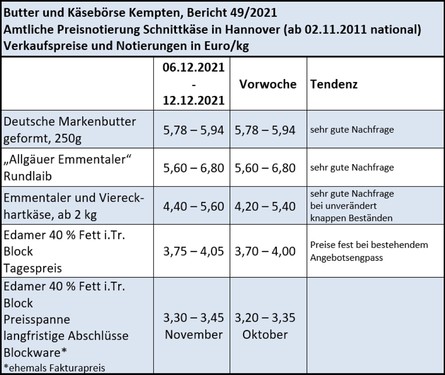 Das Vermarktungsniveau von Hartkäse erweist sich in der Adventszeit ebenfalls als gut, da der Verkauf von Hartkäse, mit den Spezialitäten Allgäuer Emmentaler, Bergkäse wie auch Emmentaler Viereckware rege voran geht. Neben dem Lebensmitteleinzelhandel werden auch weiterhin vom Großhandel noch ansprechende Mengen abgerufen, obwohl einschneidende Pandemie-Vorgaben in der Gastronomie, dort die Vermarktungsentwicklung etwas einschränkt. Da die Angebotsmengen den erhöhten Konsumnachfragen angepasst worden sind, lassen sich feste Preise, mit steigender Tendenz, umsetzen.